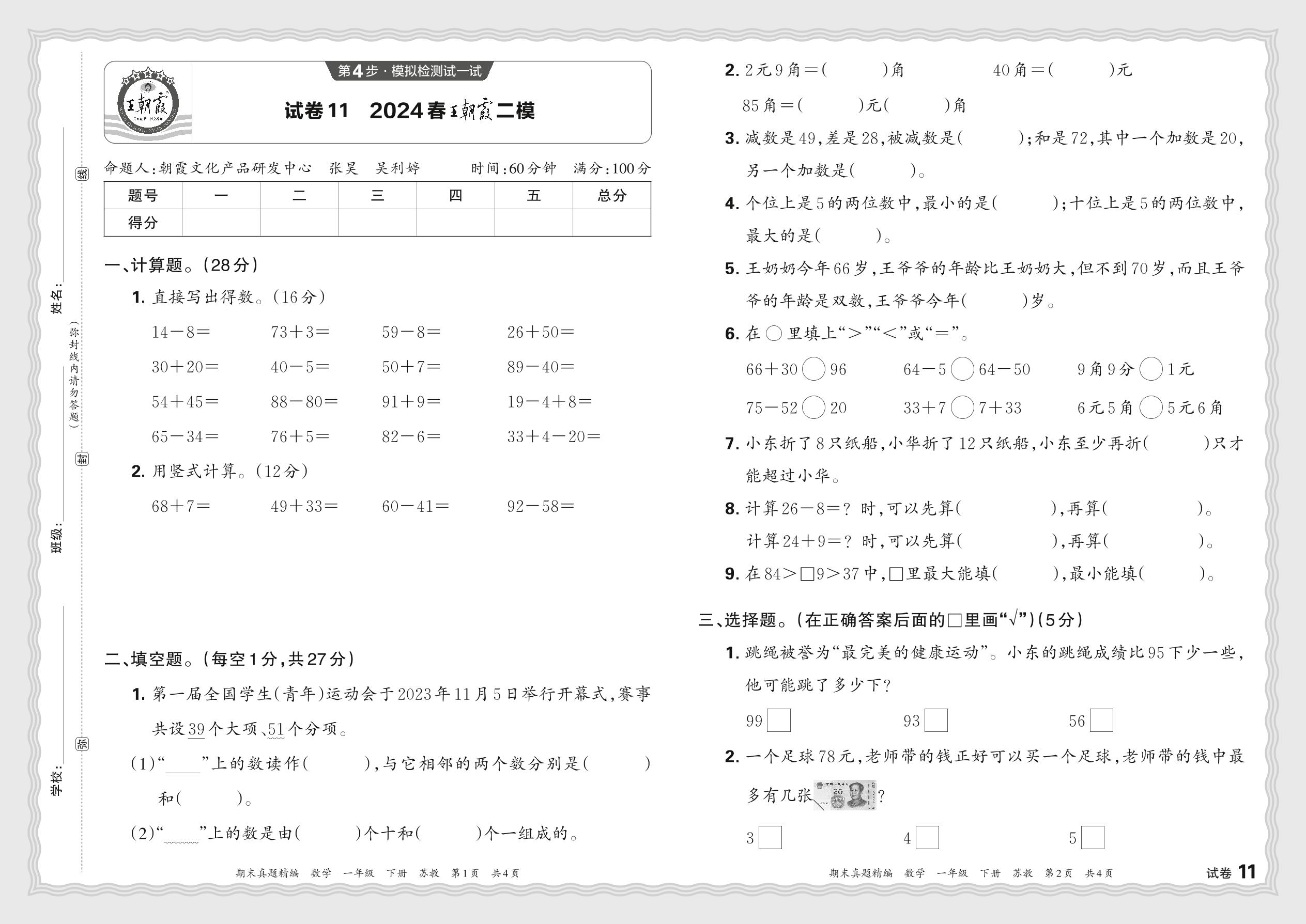 2024春下册一年级数学苏教版 王朝霞二模JB