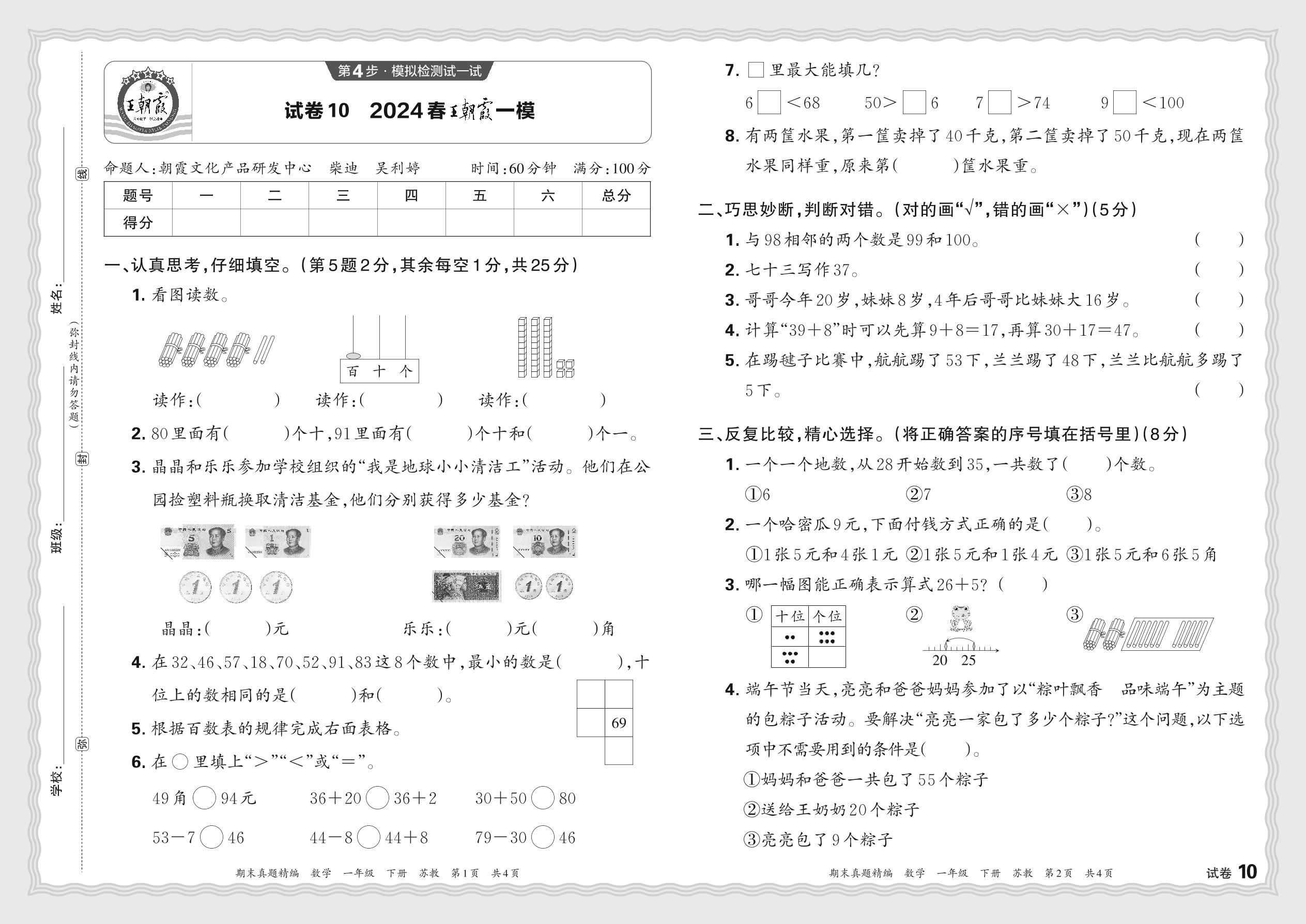 2024春下册一年级数学苏教版 王朝霞一模JB