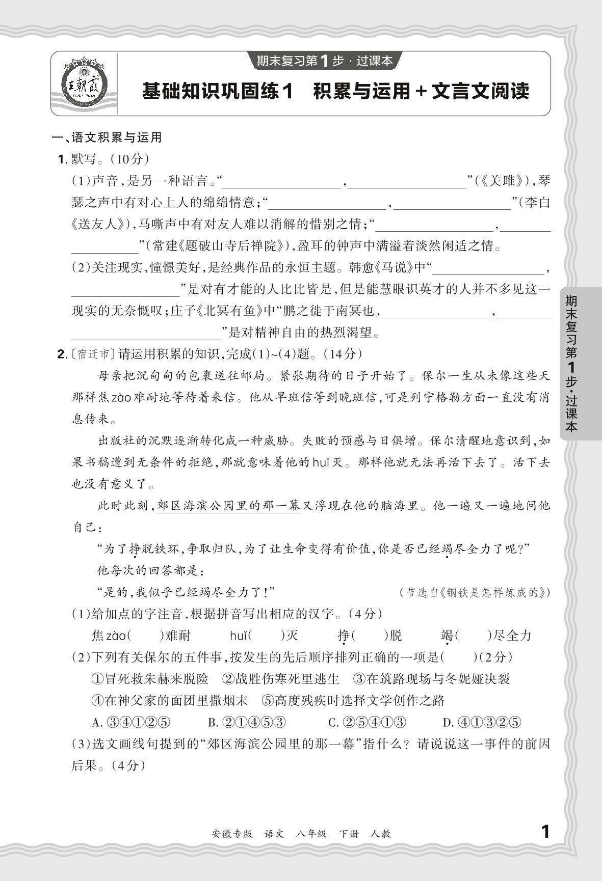 2024春下册八年级语文人教版 期末过课本安徽版·基础知识巩固练 积累与运用+文言文阅读【1】