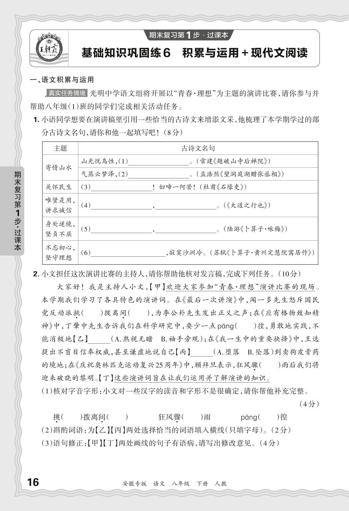 2024春下册八年级语文人教版 期末过课本安徽版·基础知识巩固练 积累与运用+现代文阅读【6】