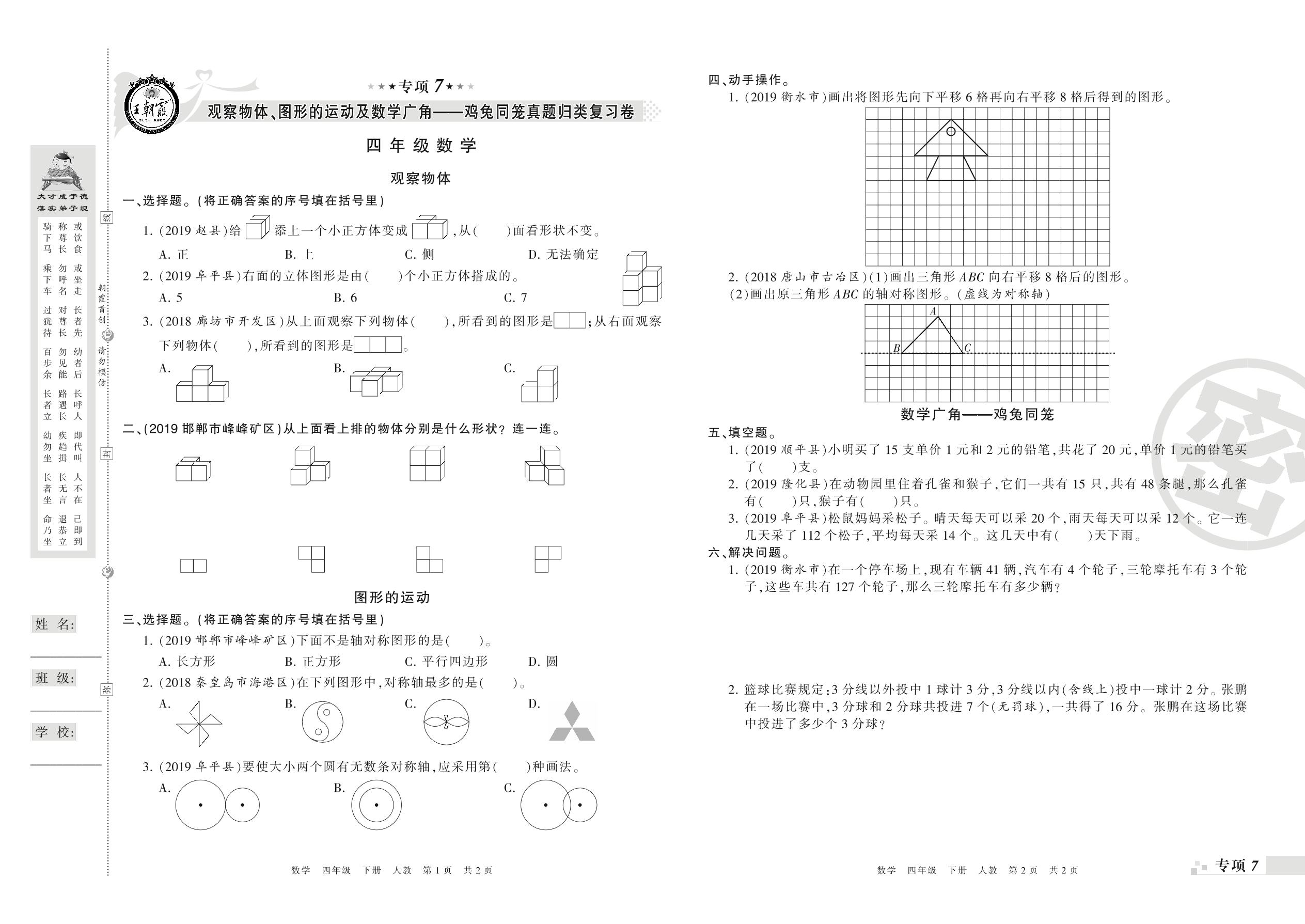 王朝霞期末专项卷——观察物体、物体的运动及数学广角:鸡兔同笼真题归类复习卷、新颖题速递:生活与数学四年级下册数学(人教版)_R210804143327【0】