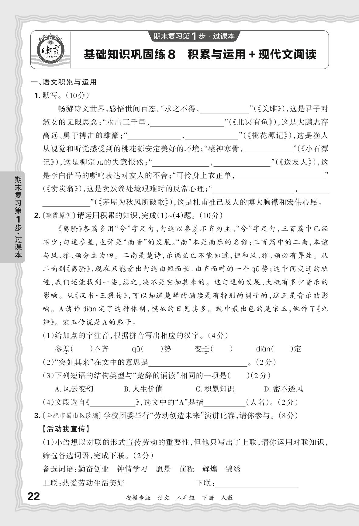2024春下册八年级语文人教版 期末过课本安徽版·基础知识巩固练 积累与运用+现代文阅读【8】