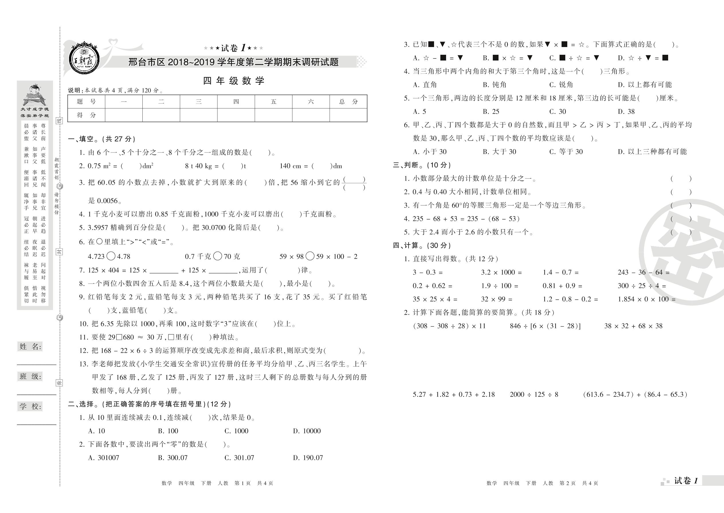 2018-2019学年第二学期邢台市区四年级数学试卷(人教版)【1】