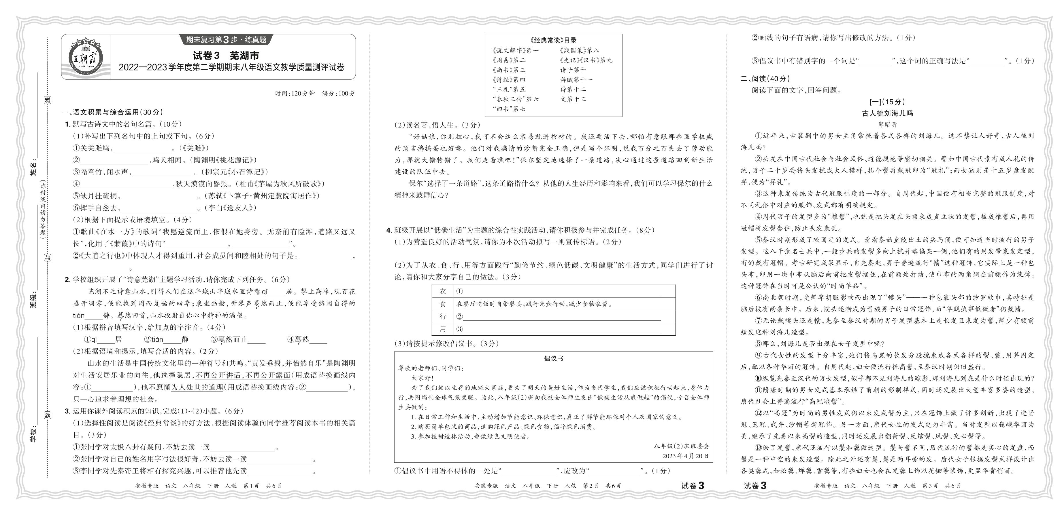 安徽省芜湖市2022-2023学年度第二学期期末八年级语文教学质量测评试卷(人教版)【3】