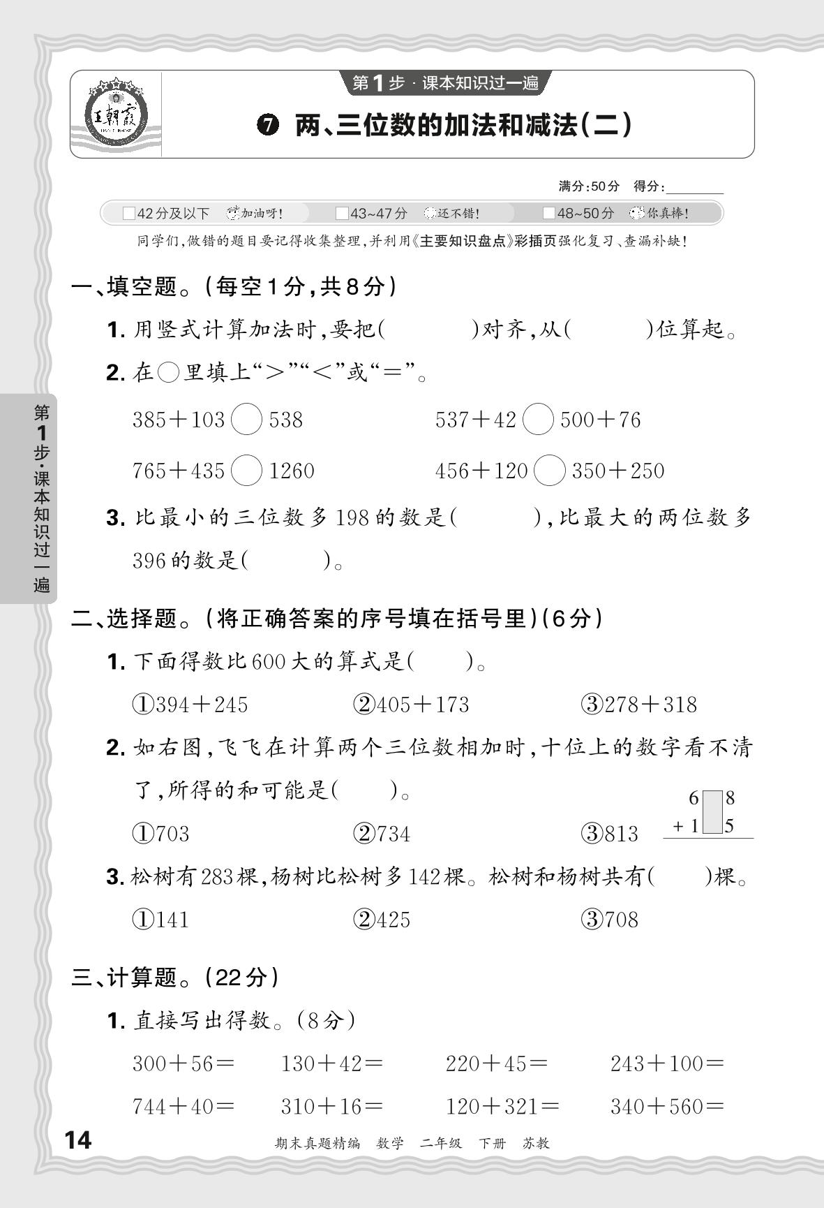 2024春下册二年级数学苏教版 期末过课本JB版·两、三位数的加法和减法(二)【7】