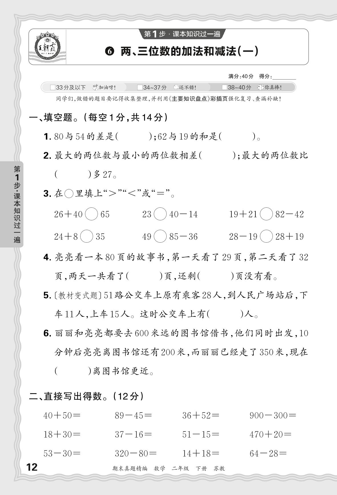 2024春下册二年级数学苏教版 期末过课本JB版·两、三位数的加法和减法(一)【6】