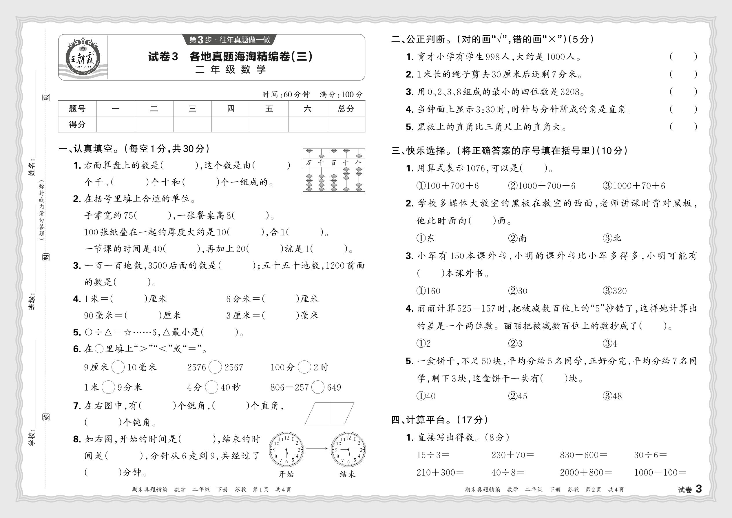 2024春下册二年级数学苏教版 各地真题海淘精编卷(三)JB