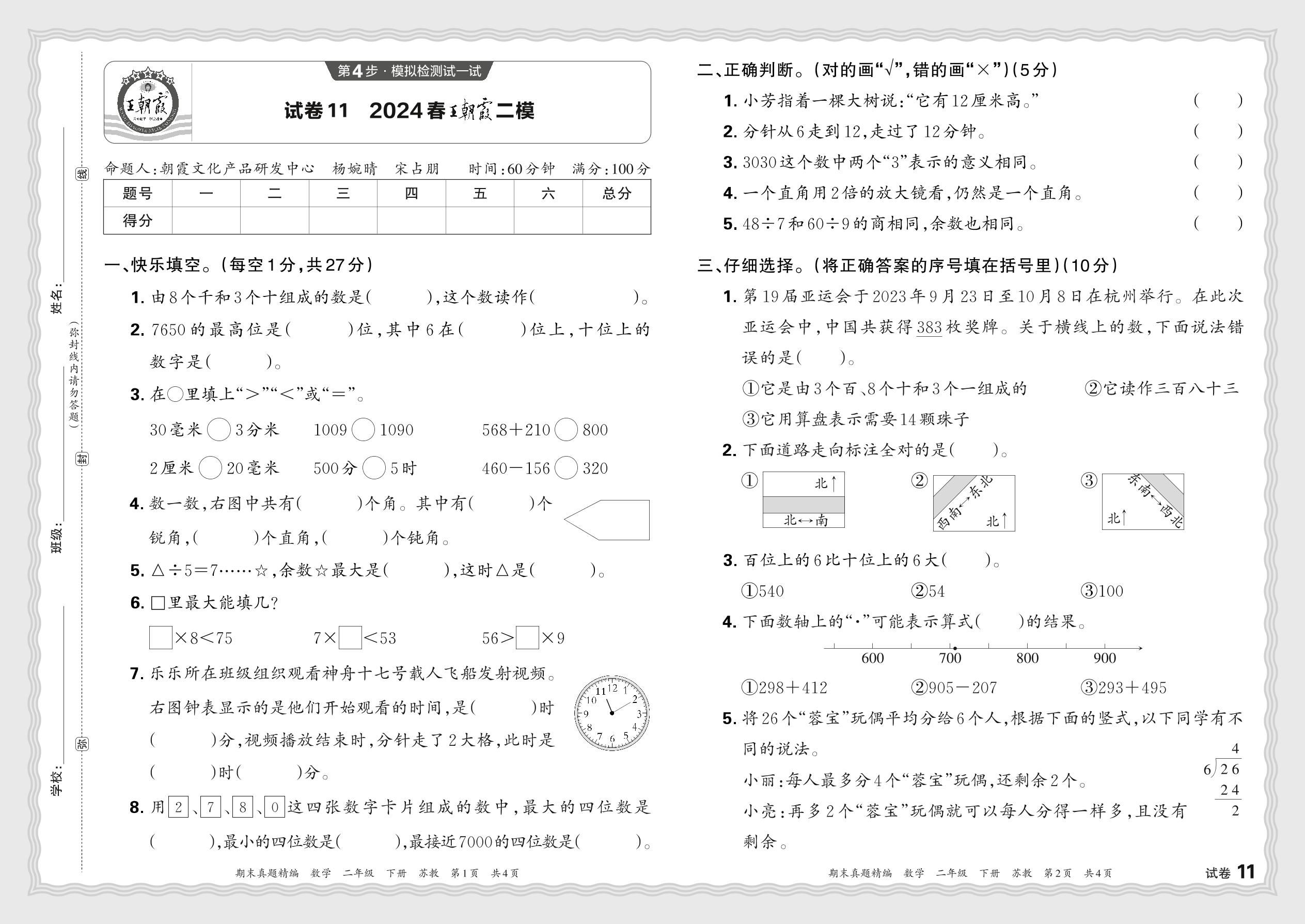 2024春下册二年级数学苏教版 王朝霞二模JB