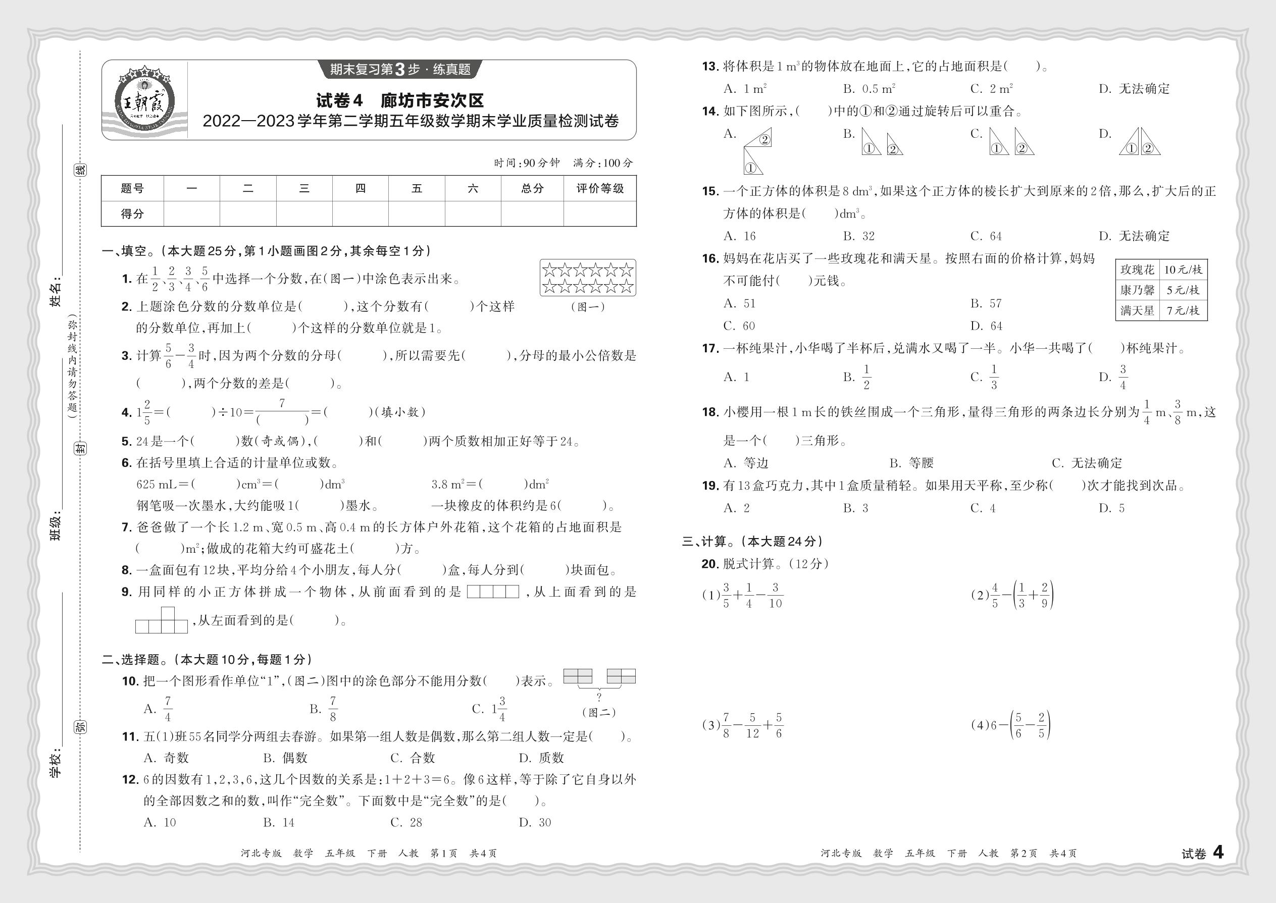 河北省廊坊市安次区2022—2023学年第二学期五年级数学期末学业质量检测试卷(人教版)【4】