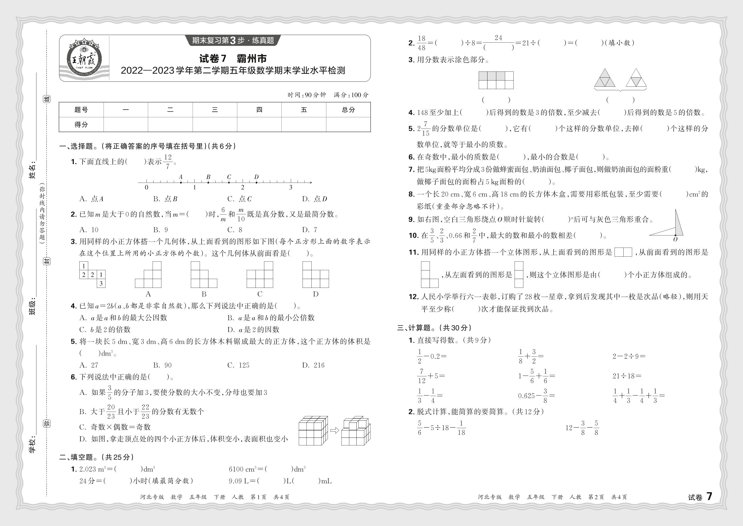河北省廊坊市霸州市2022—2023学年第二学期五年级数学期末学业水平检测(人教版)【7】
