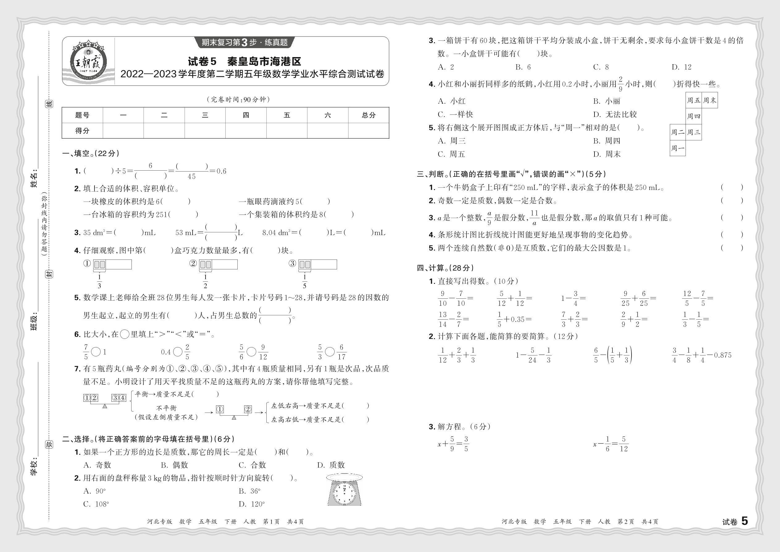 河北省秦皇岛市海港区2022—2023学年度第二学期五年级数学学业水平综合测试试卷(人教版)【5】