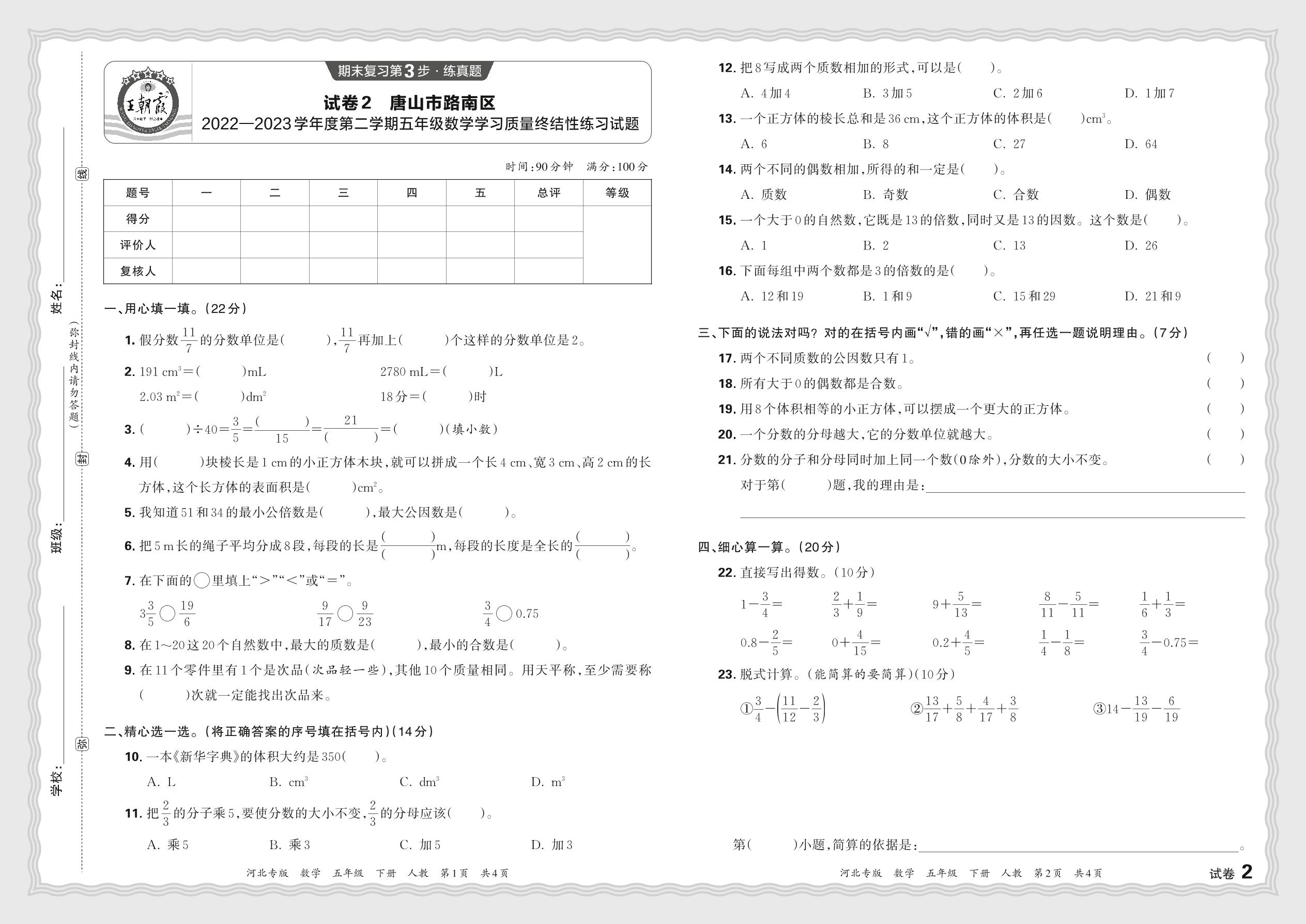 河北省唐山市路南区2022—2023学年度第二学期五年级数学学习质量终结性练习试题(人教版)【2】