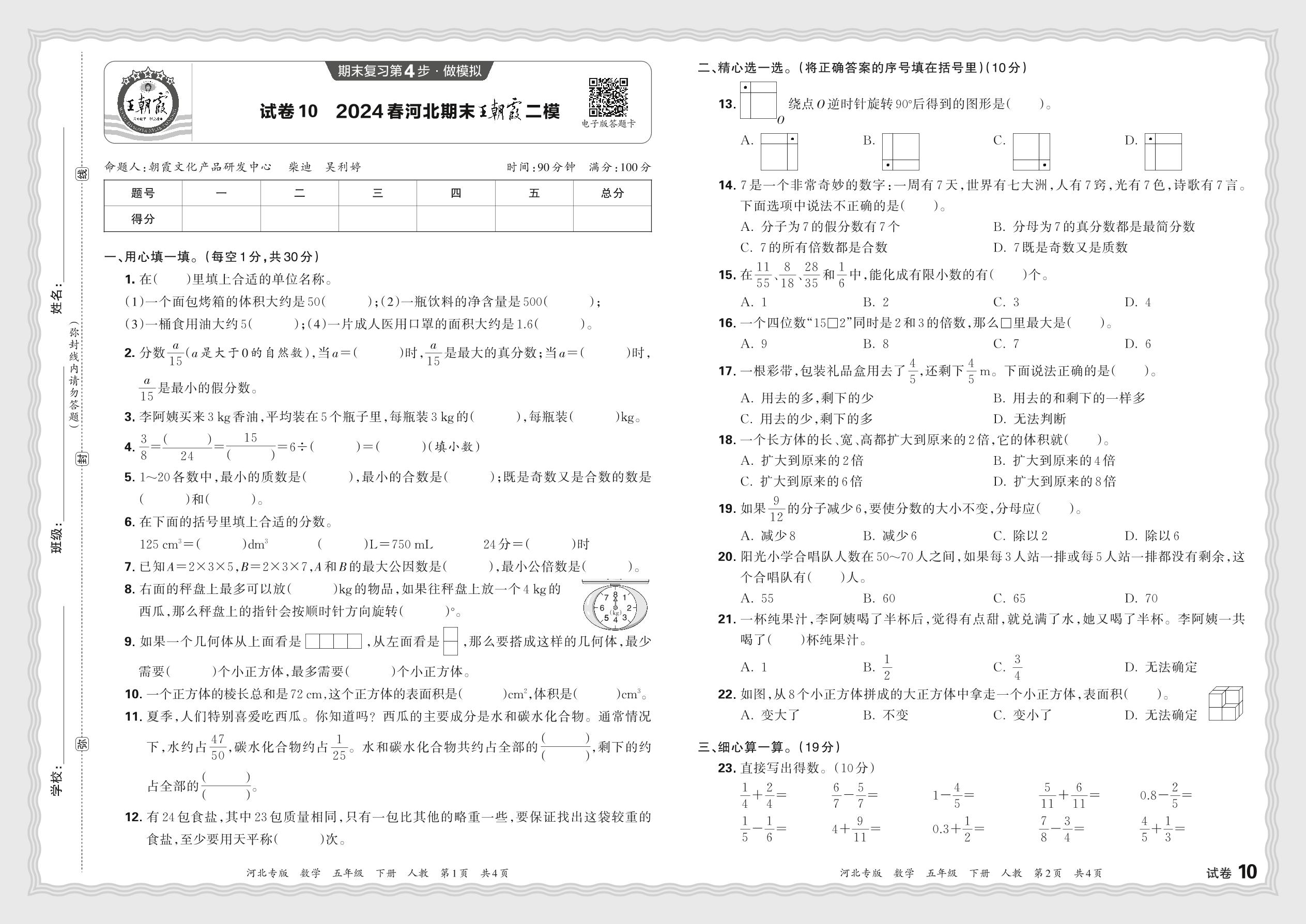 2024春下册五年级数学人教版 河北期末王朝霞二模