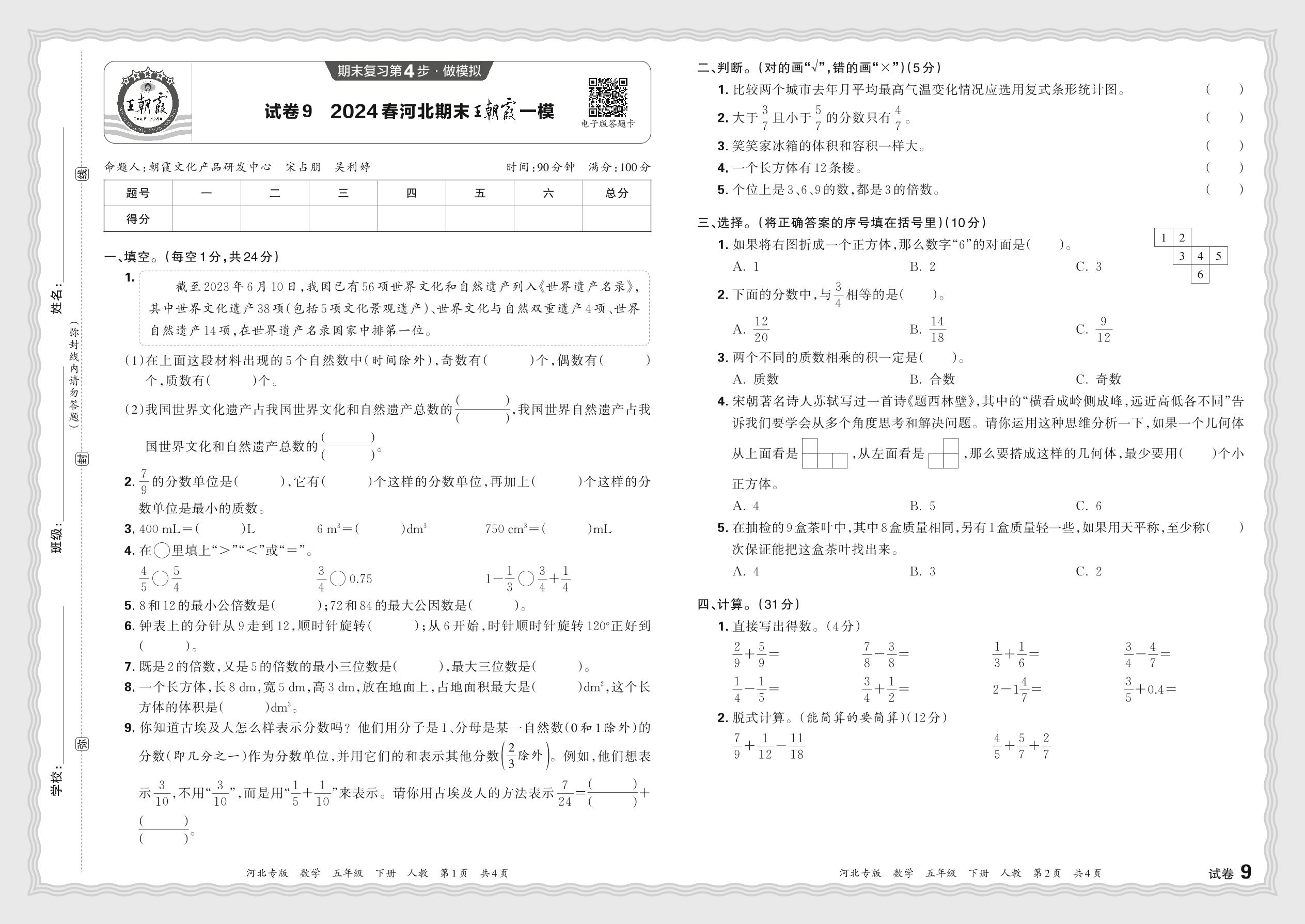 2024春下册五年级数学人教版 河北期末王朝霞一模