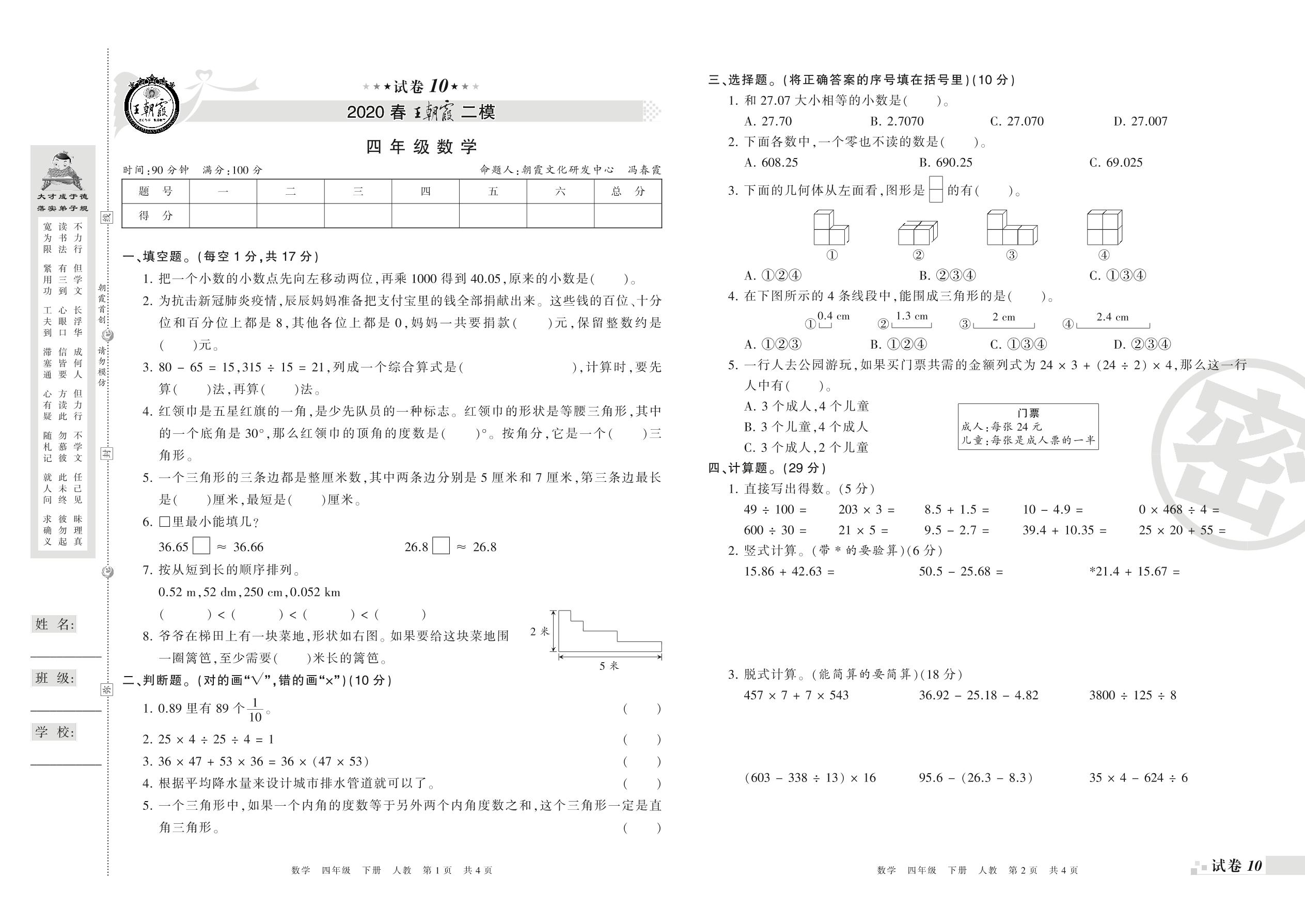 王朝霞期末模拟卷四年级下册数学(人教版)_R210804143403【10】