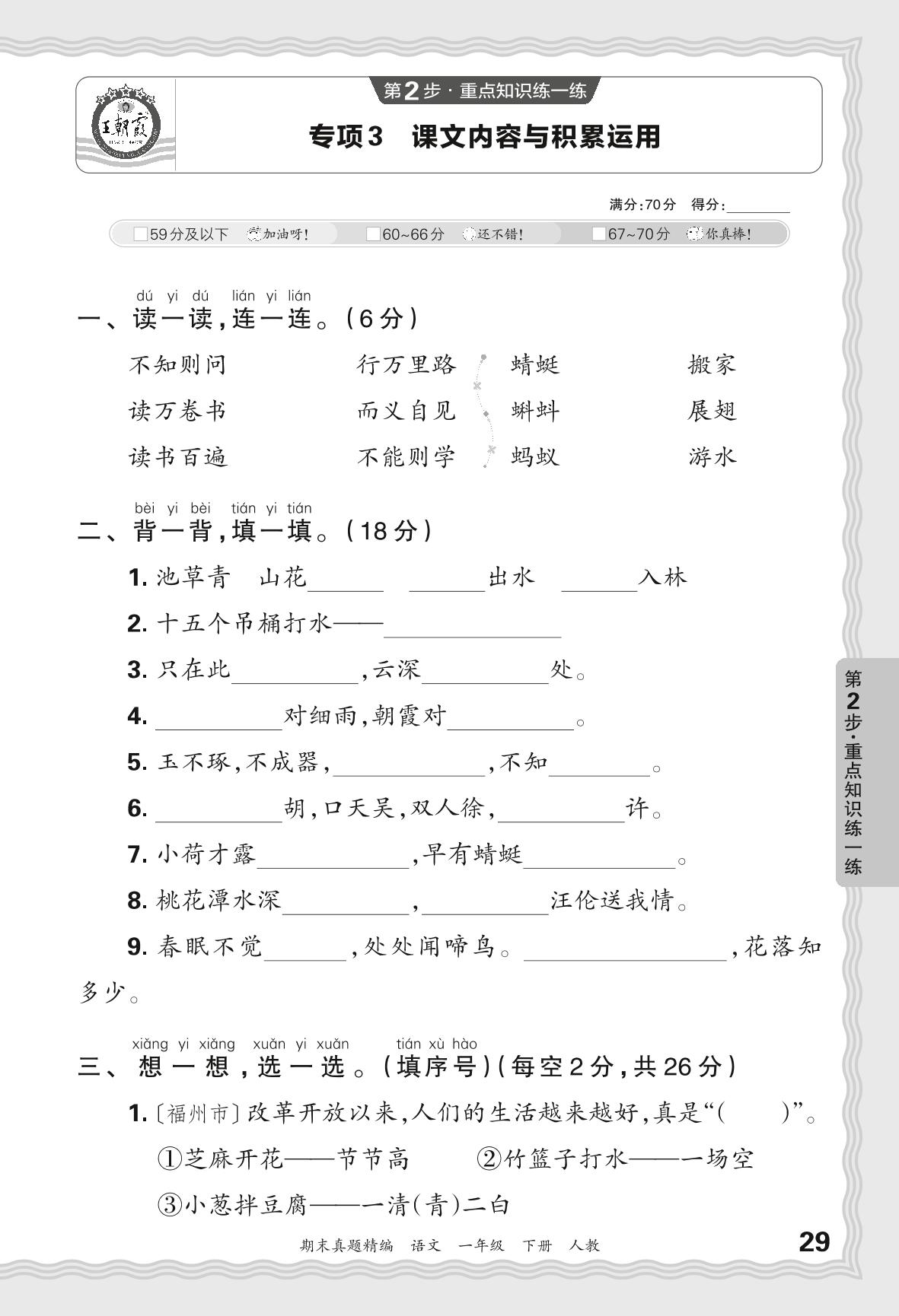 2024春下册一年级语文人教版 期末专项卷JB版·课文内容与积累运用【3】