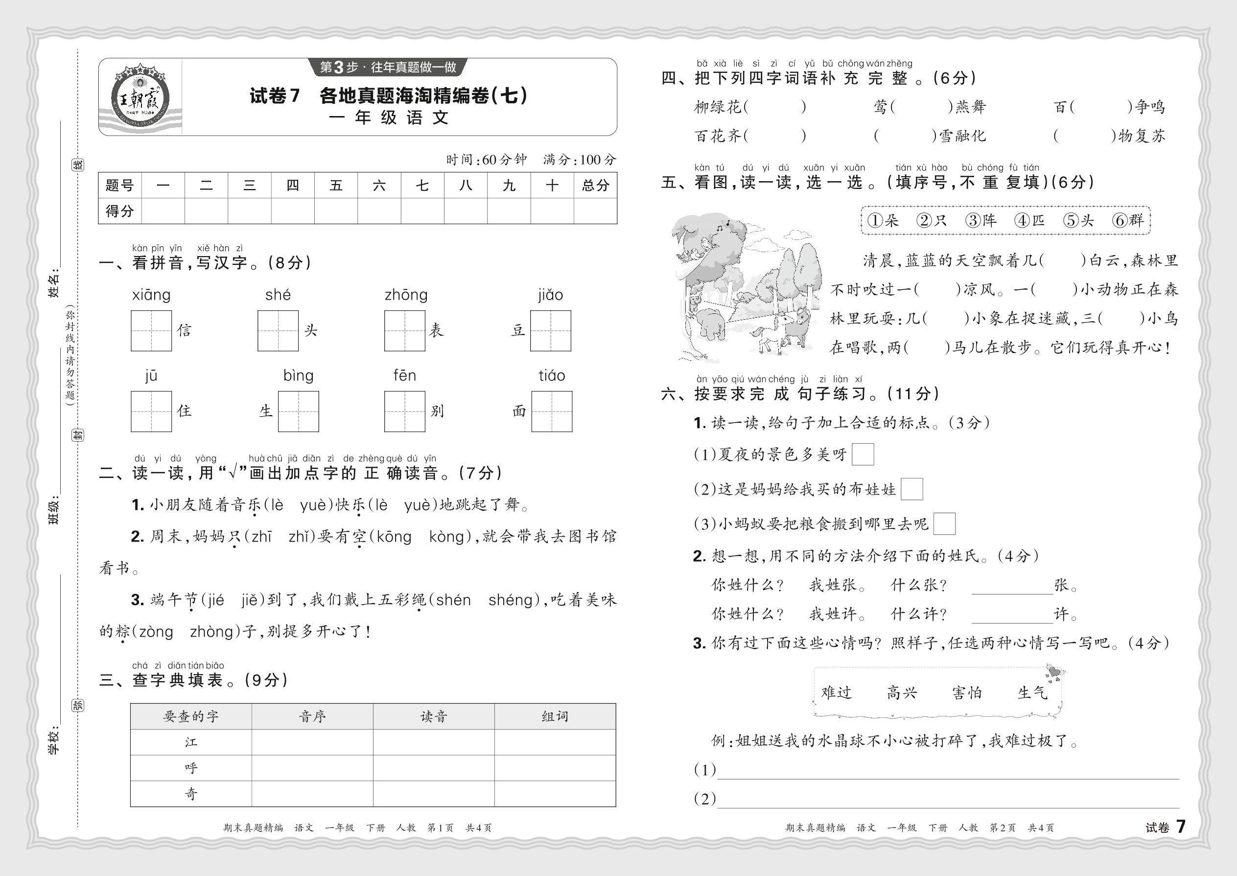 2024春下册一年级语文人教版 各地真题海淘精编卷(七)JB