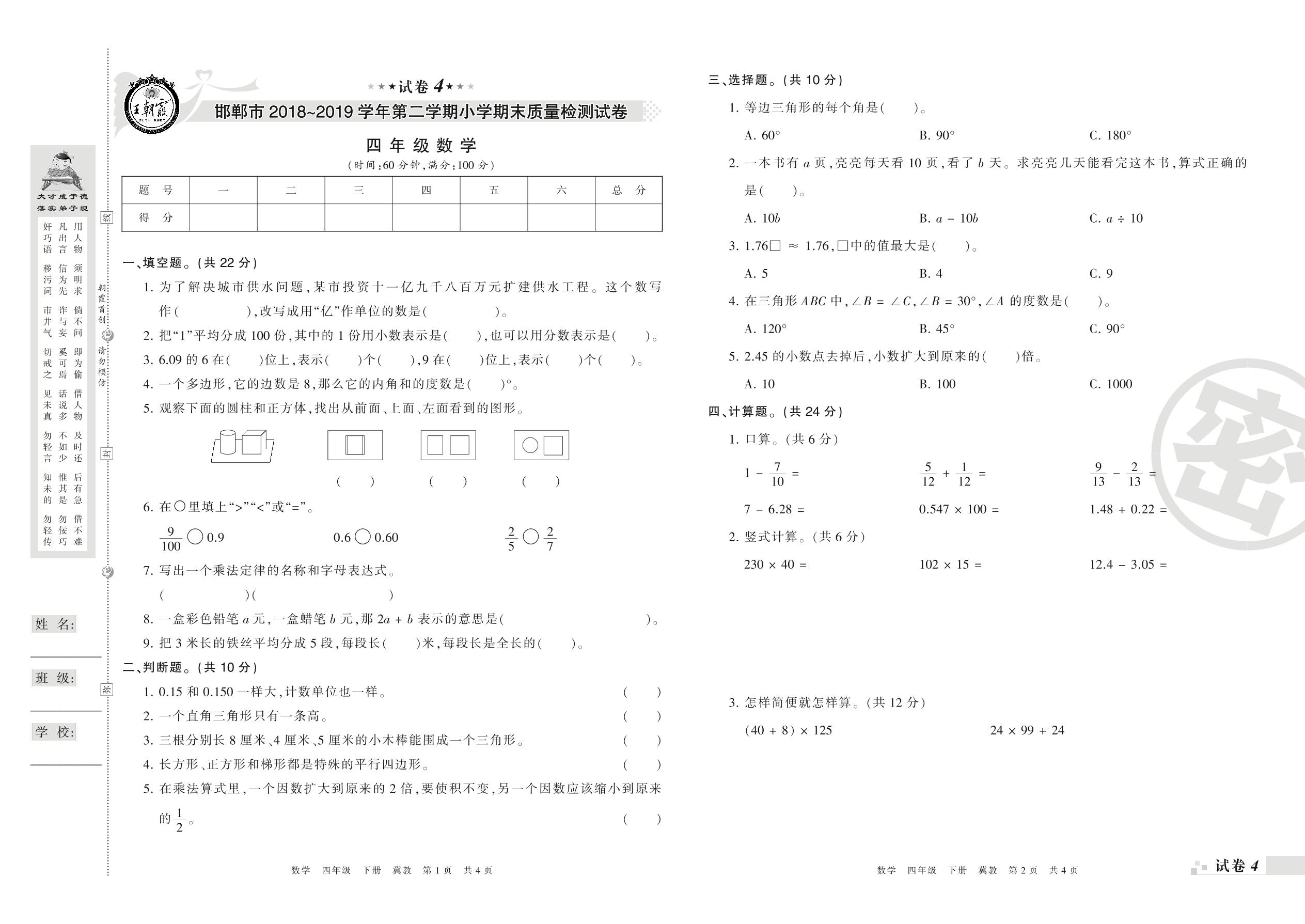 2018-2019学年第二学期邯郸市四年级数学试卷(冀教版)【4】