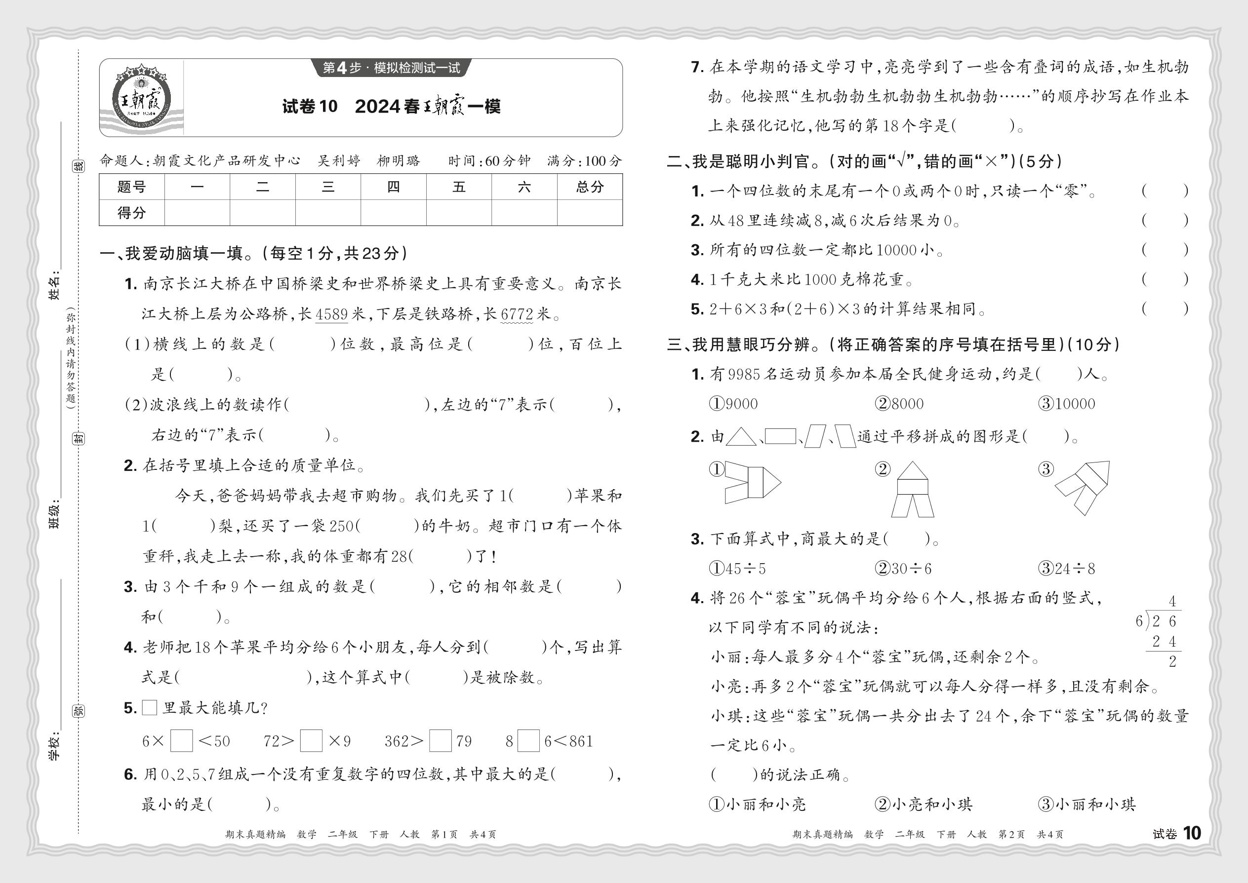 2024春下册二年级数学人教版 王朝霞一模JB