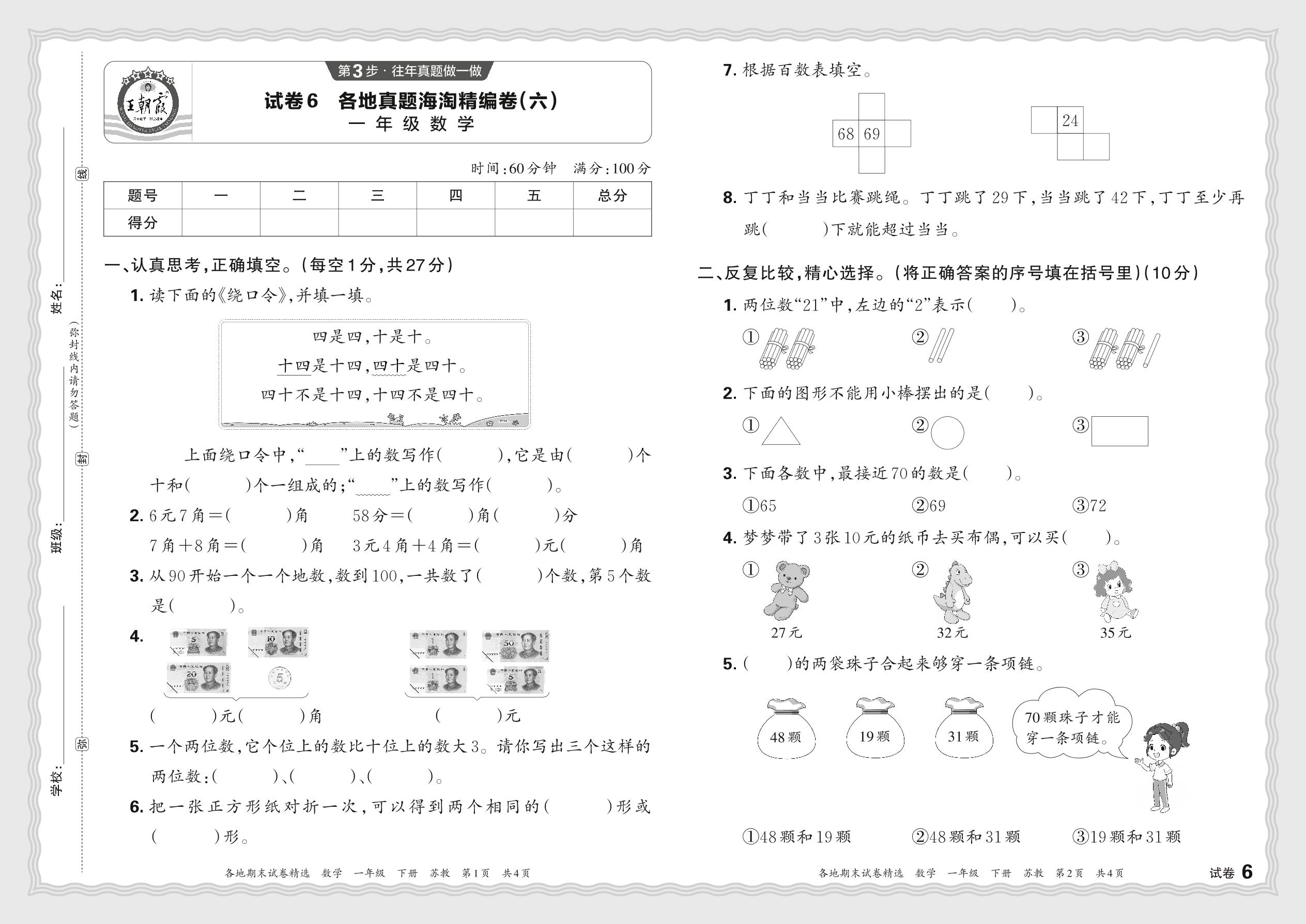 一年级数学苏教版下册期末卷