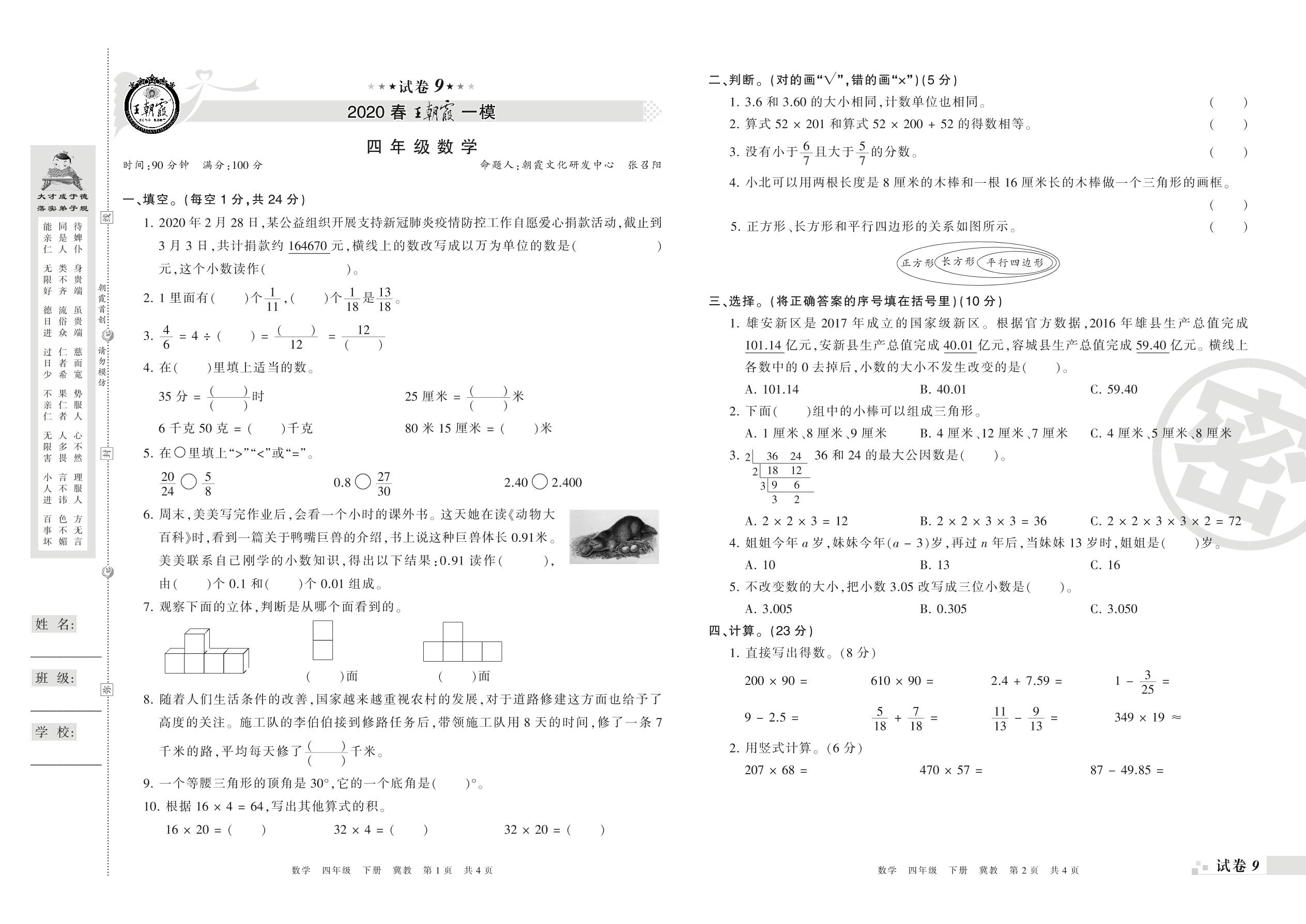 王朝霞期末模拟卷四年级下册数学(冀教版)_R210804143459【9】