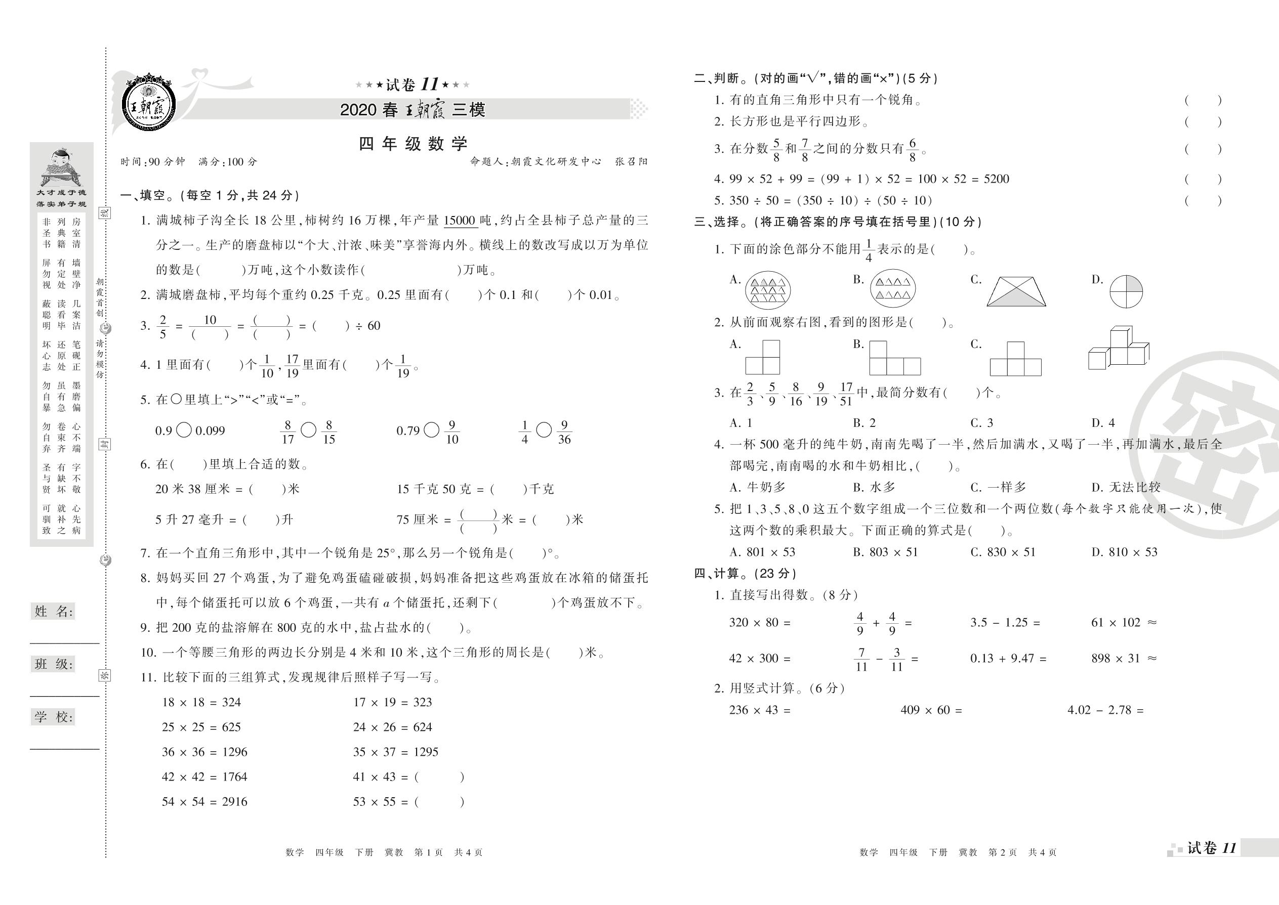 王朝霞期末模拟卷四年级下册数学(冀教版)_R210804143507【11】