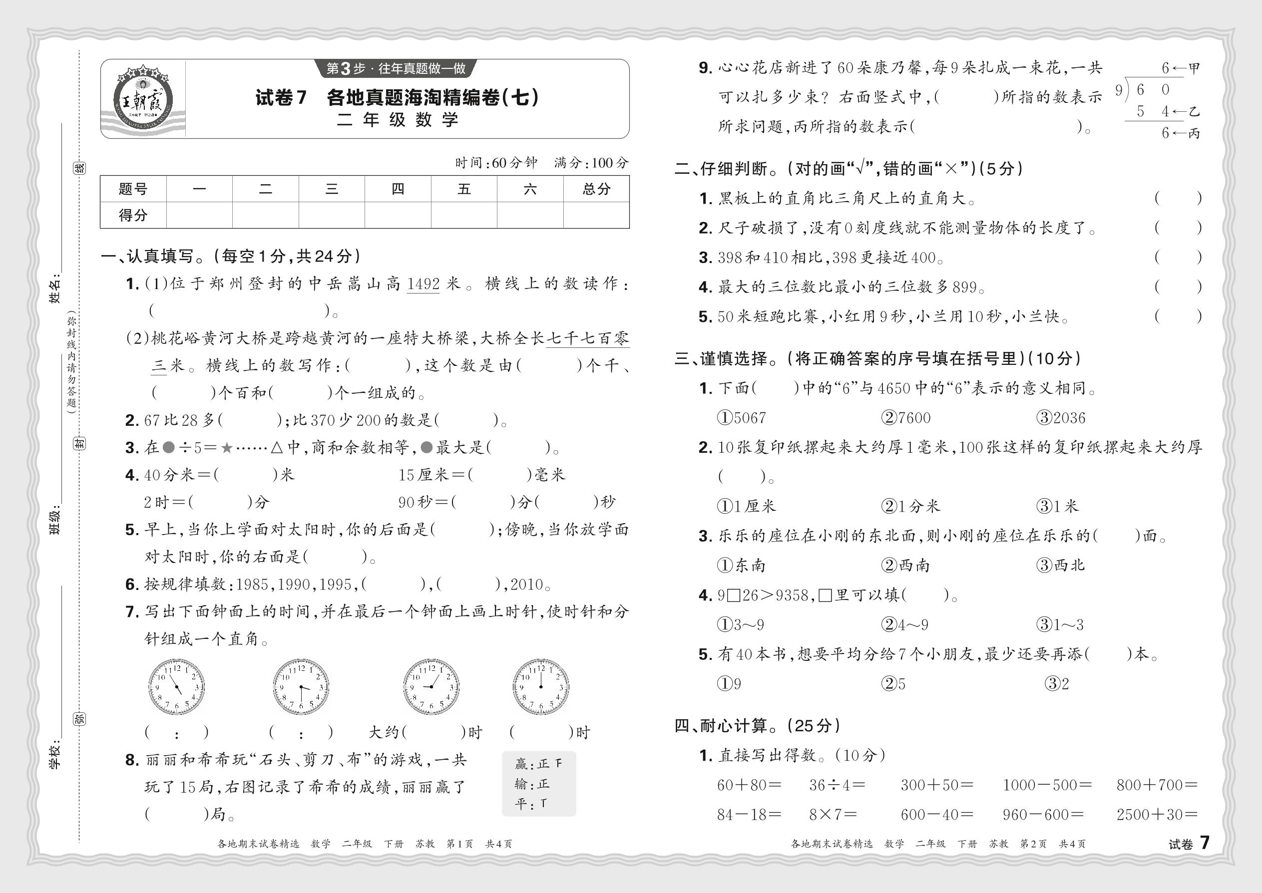 2024春下册二年级数学苏教版 各地真题海淘精编卷(七)JX