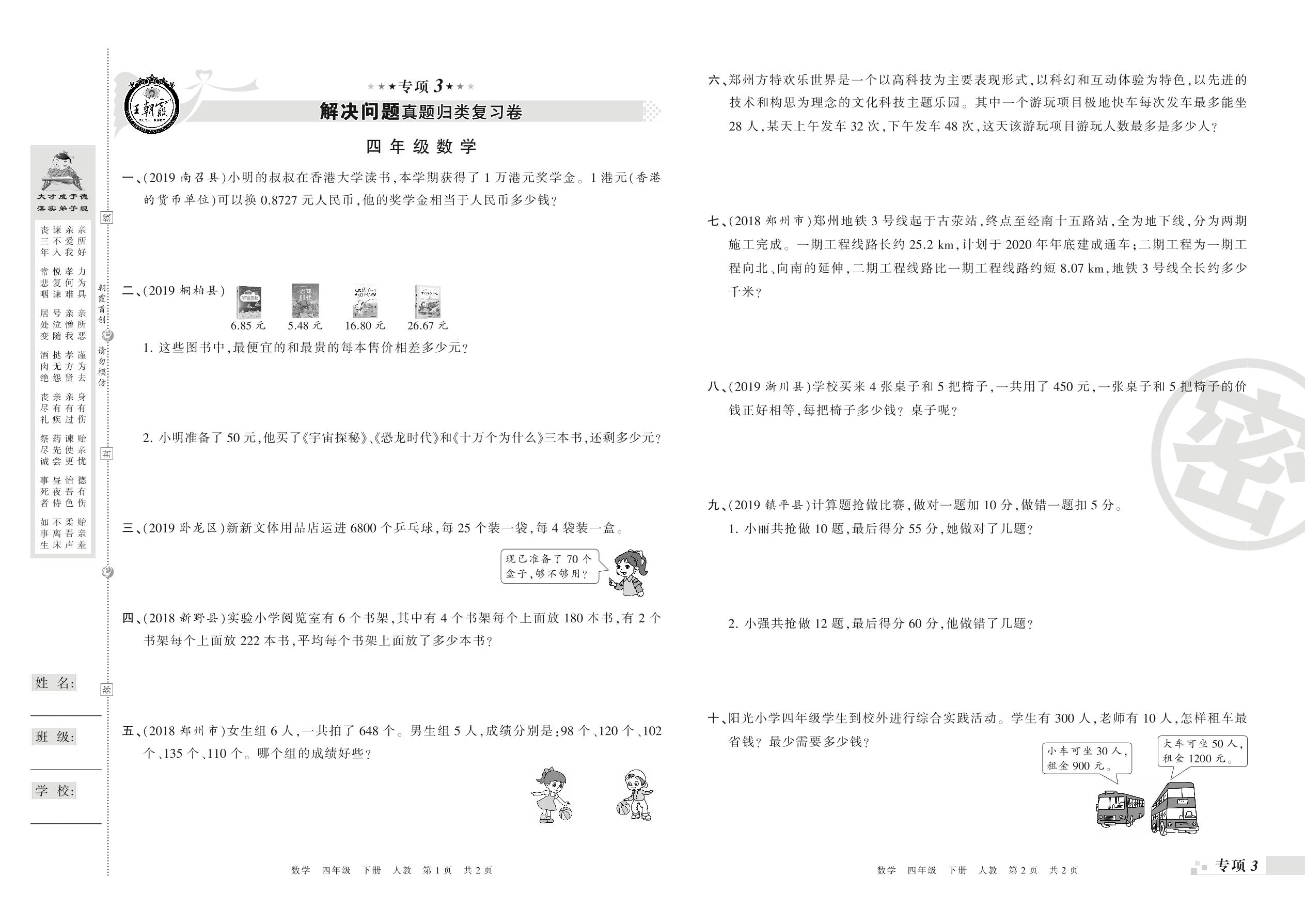 王朝霞期末专项卷——解决问题真题归类复习卷、新颖题速递:生活与数学四年级下册数学(人教版)_R210804143527【0】