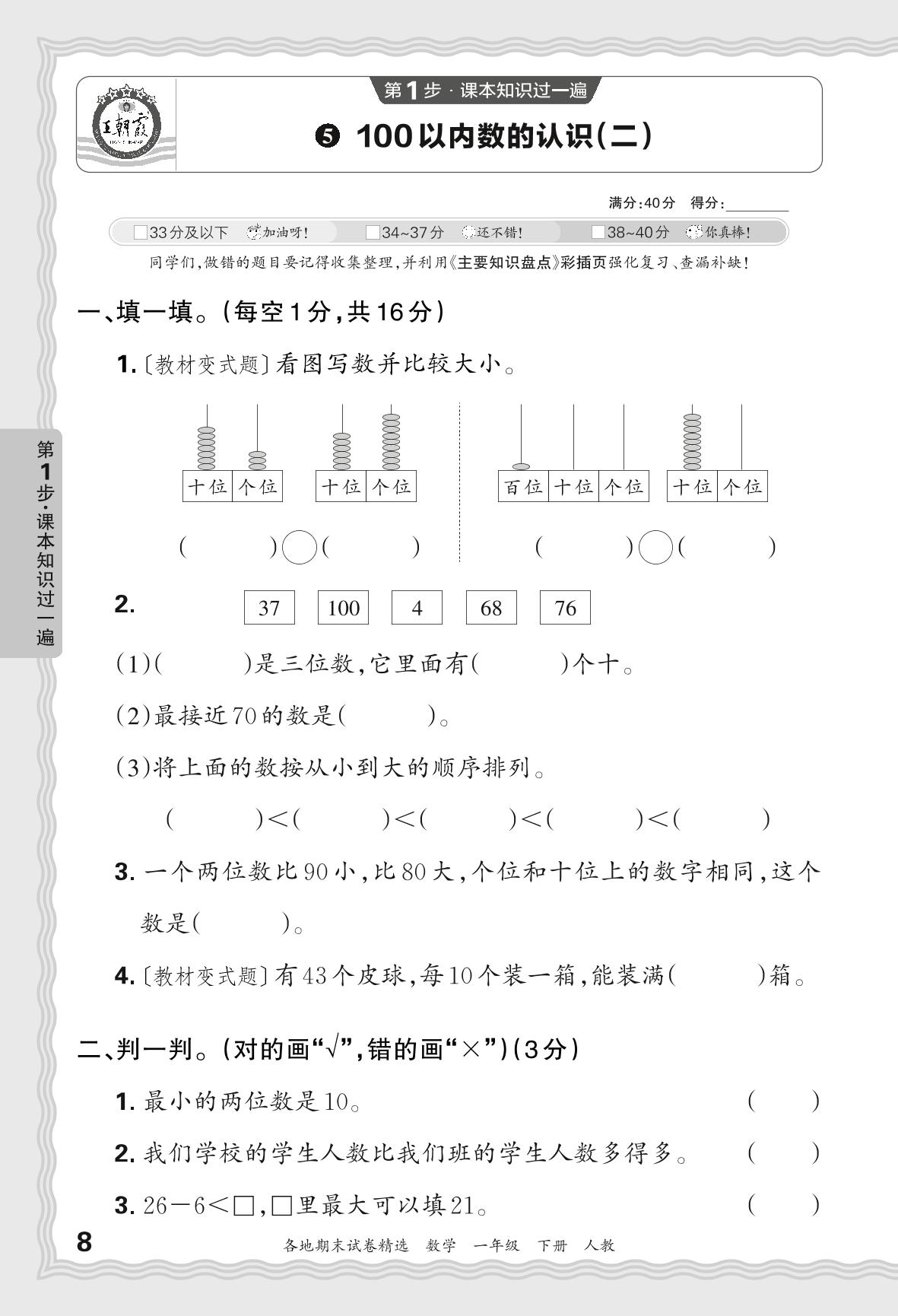 2024春下册一年级数学人教版 期末过课本JX版·100以内数的认识(二)【5】