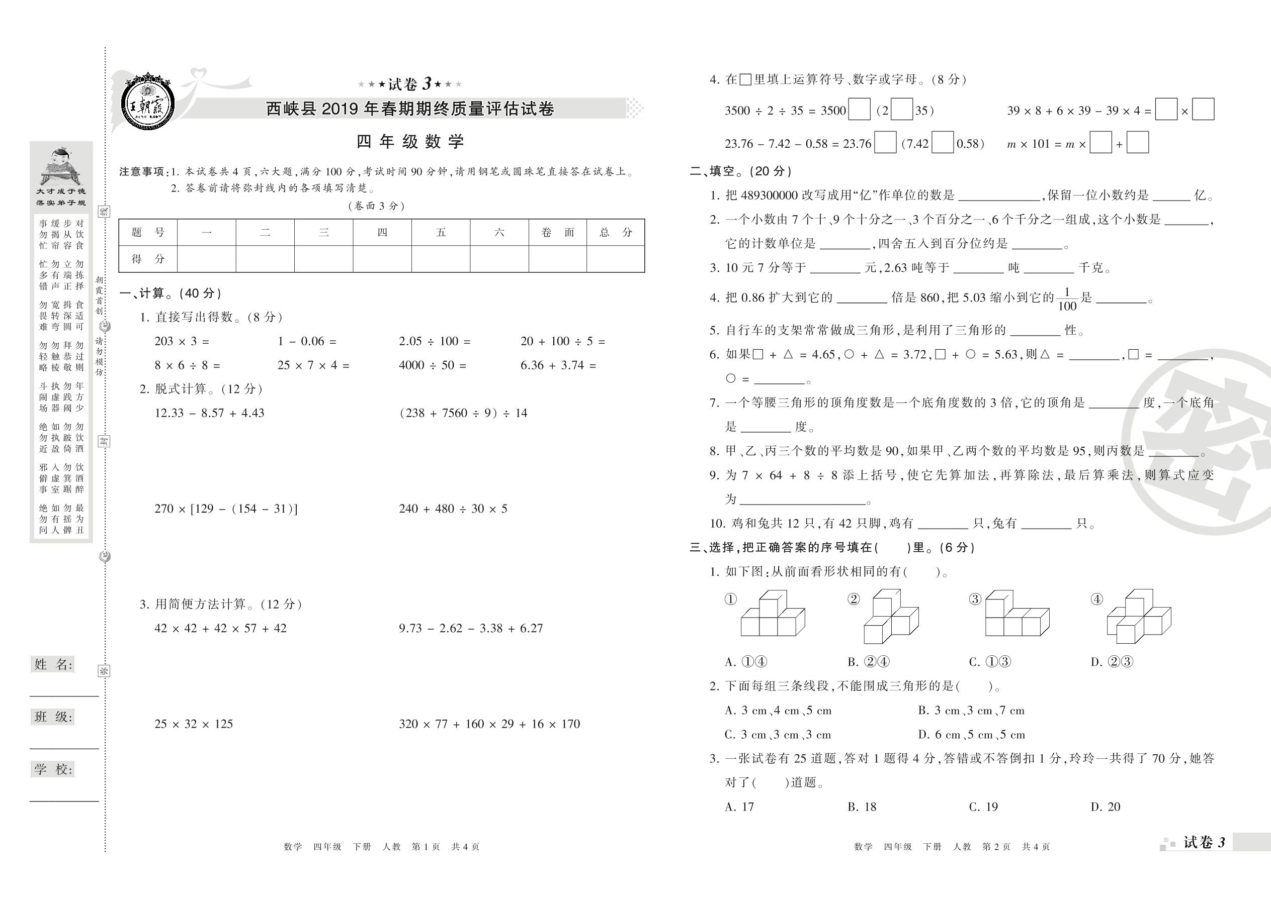 2018-2019学年第二学期南阳市西峡县四年级数学试卷(人教版)【3】