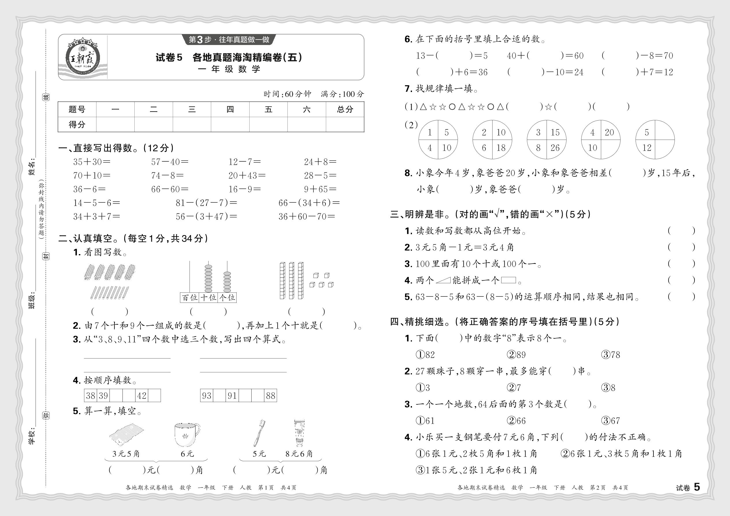 2024春下册一年级数学人教版 各地真题海淘精编卷(五)JX