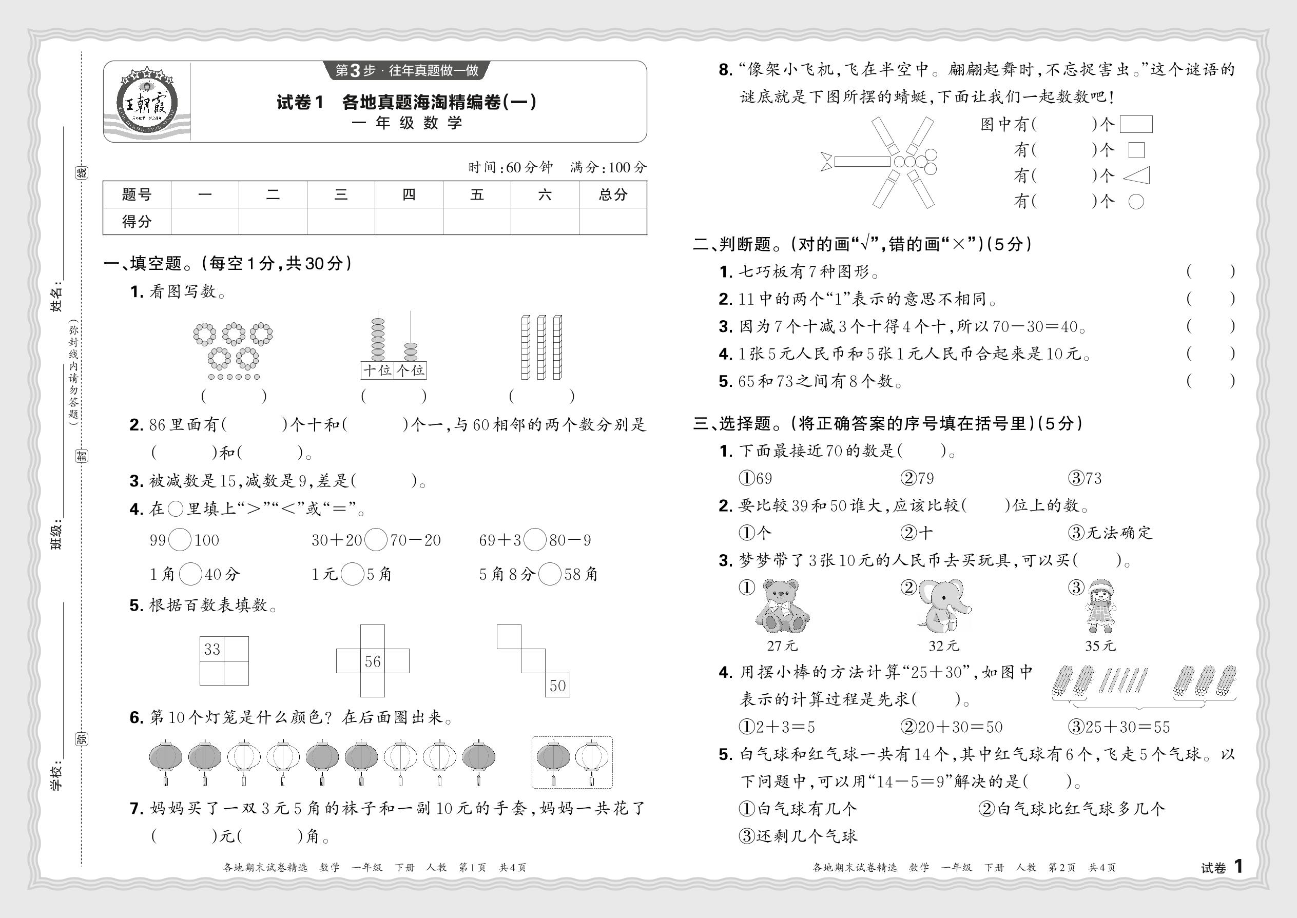 2024春下册一年级数学人教版 各地真题海淘精编卷(一)JX