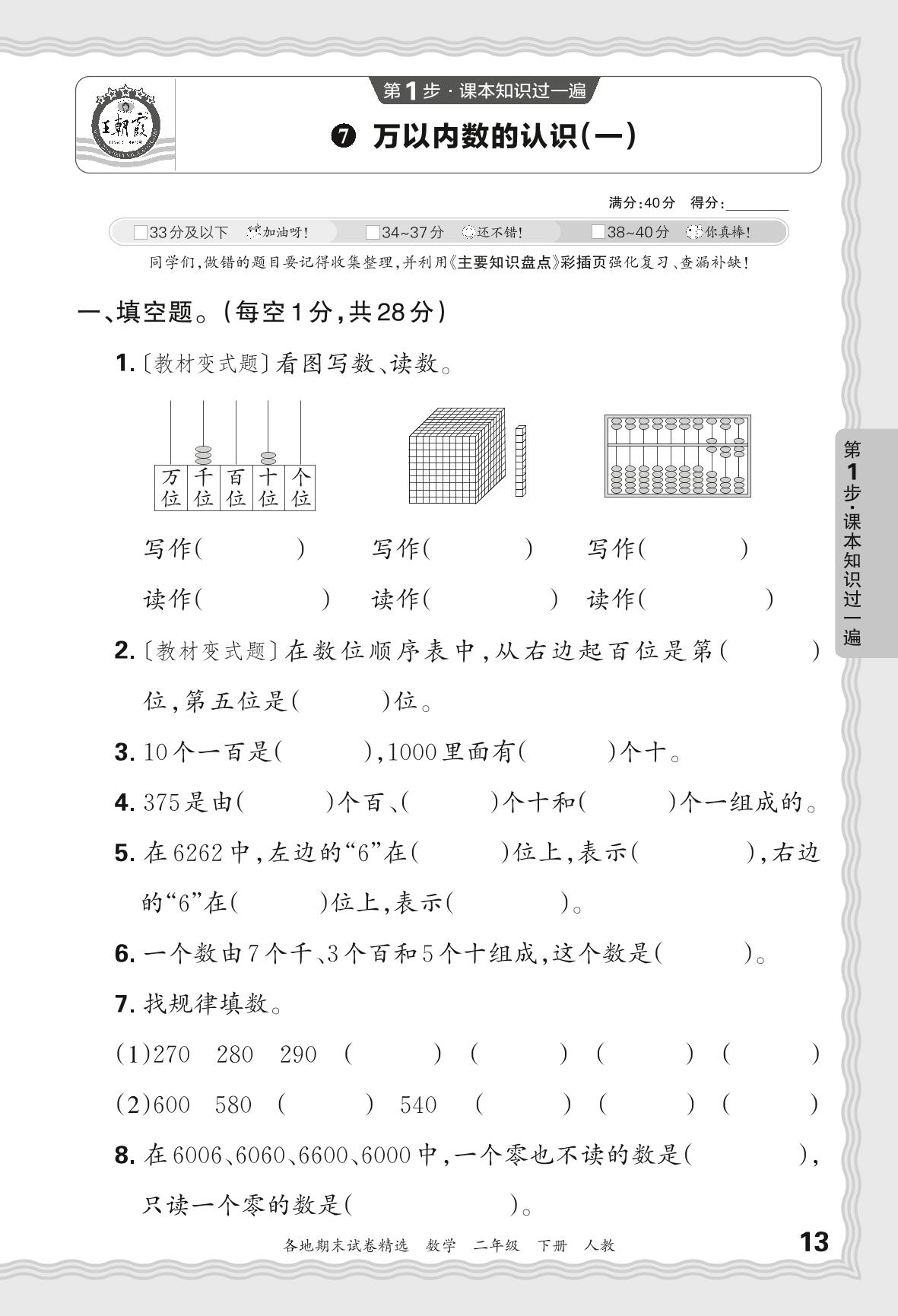 2024春下册二年级数学人教版 期末过课本JX版·万以内数的认识(一)【7】