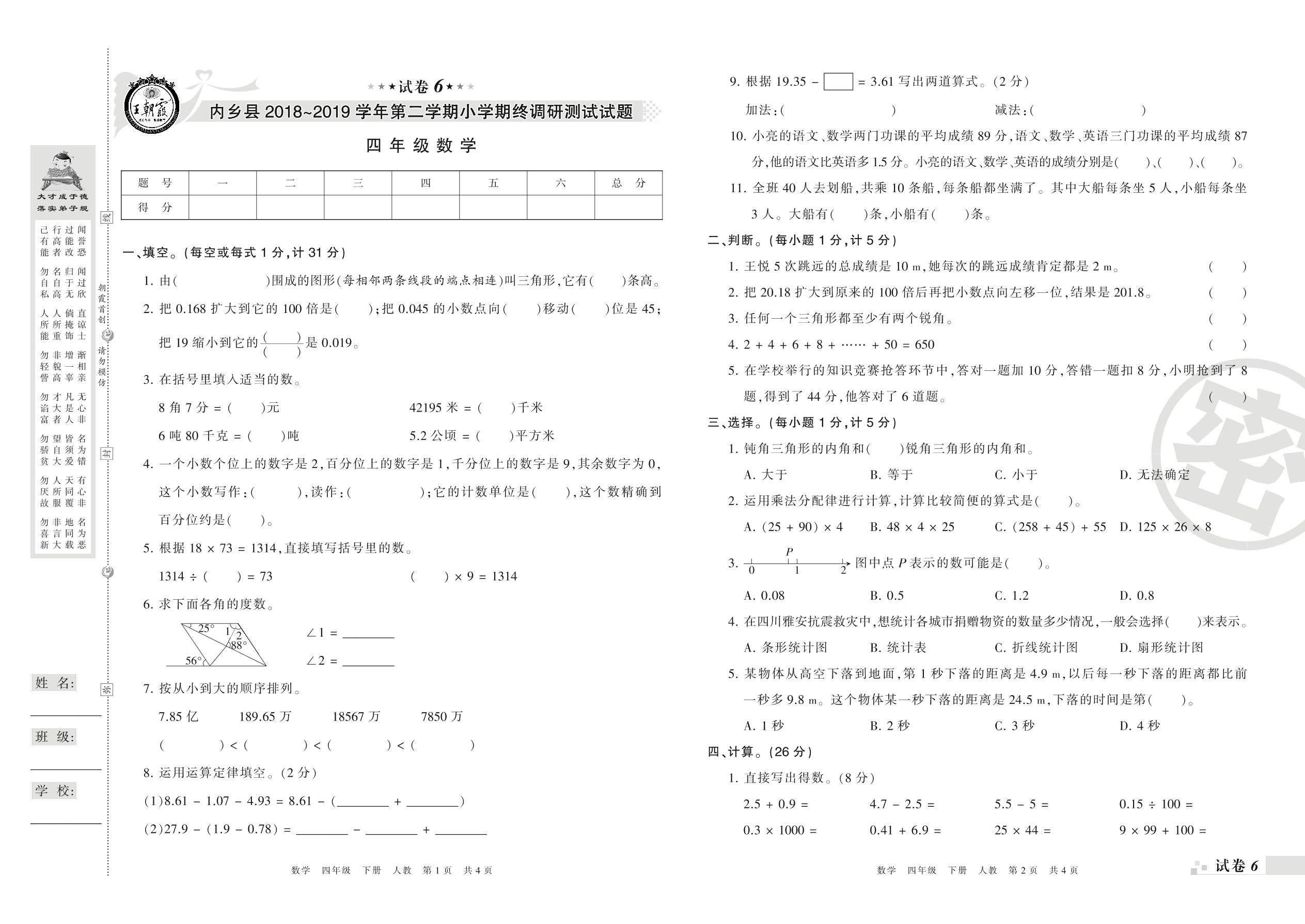 2018-2019学年第二学期南阳市社旗县四年级数学试卷(人教版)【6】