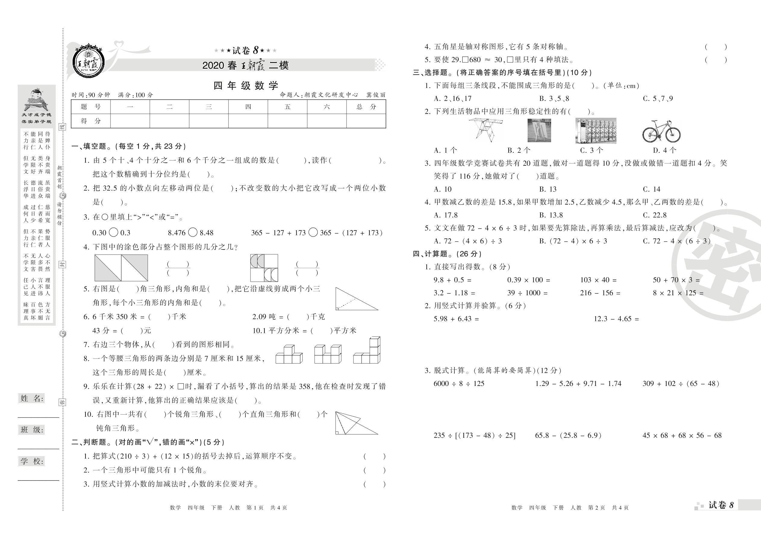 王朝霞期末模拟卷四年级下册数学(人教版)_R210804143555【8】