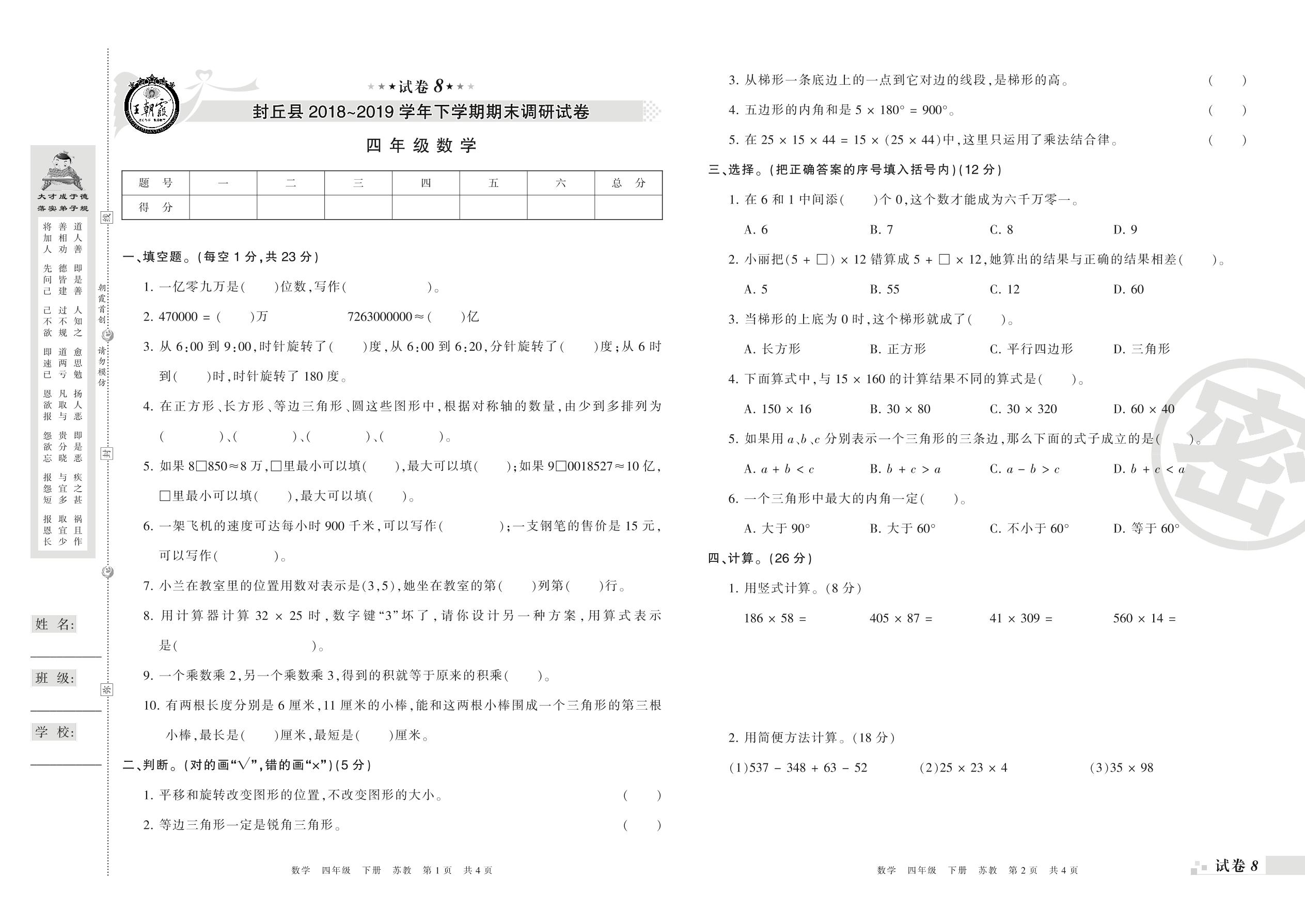 2018-2019学年第二学期新乡市封丘县四年级数学试卷(苏教版)【8】
