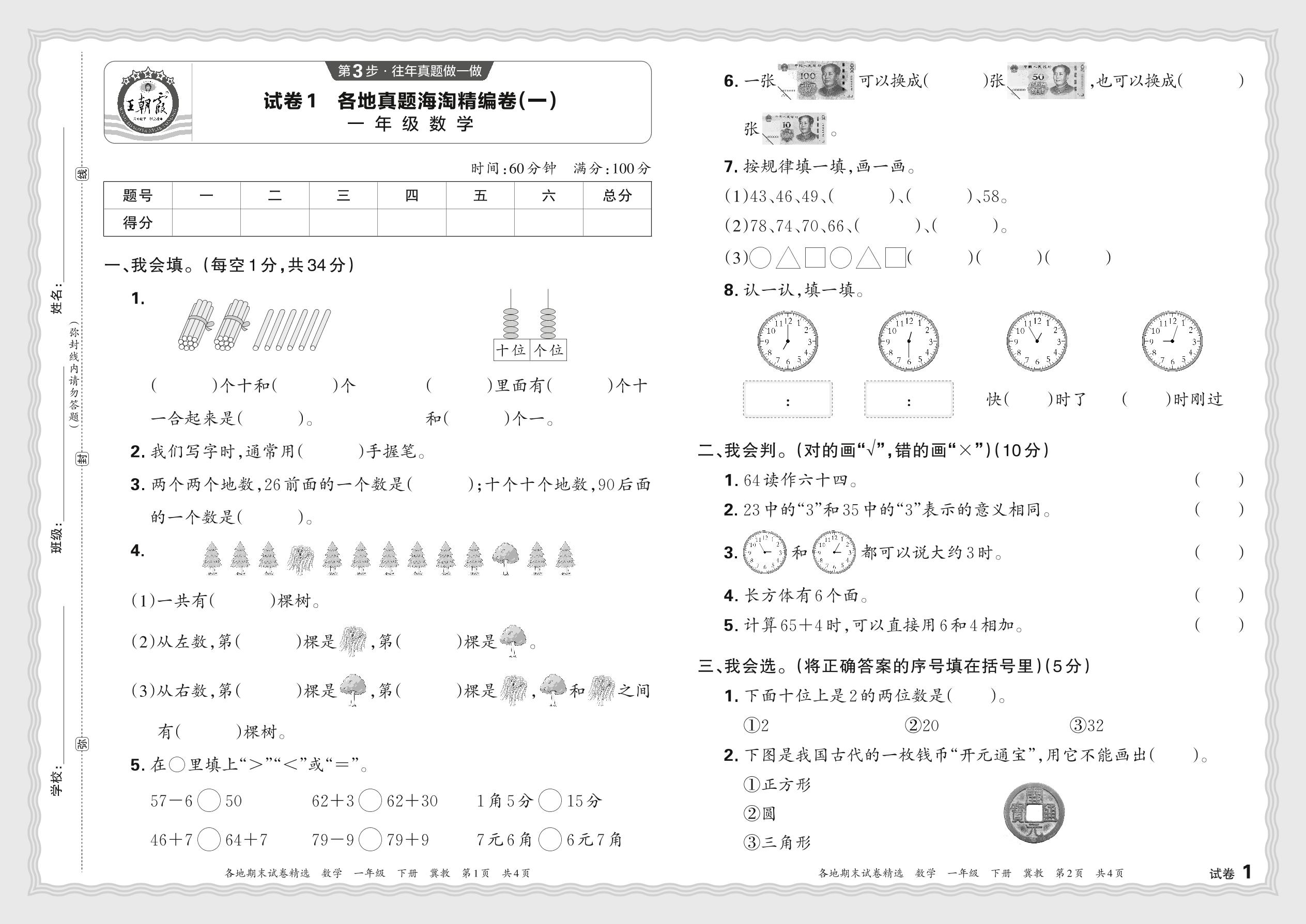 2024春下册一年级数学冀教版 各地真题海淘精编卷(一)JX