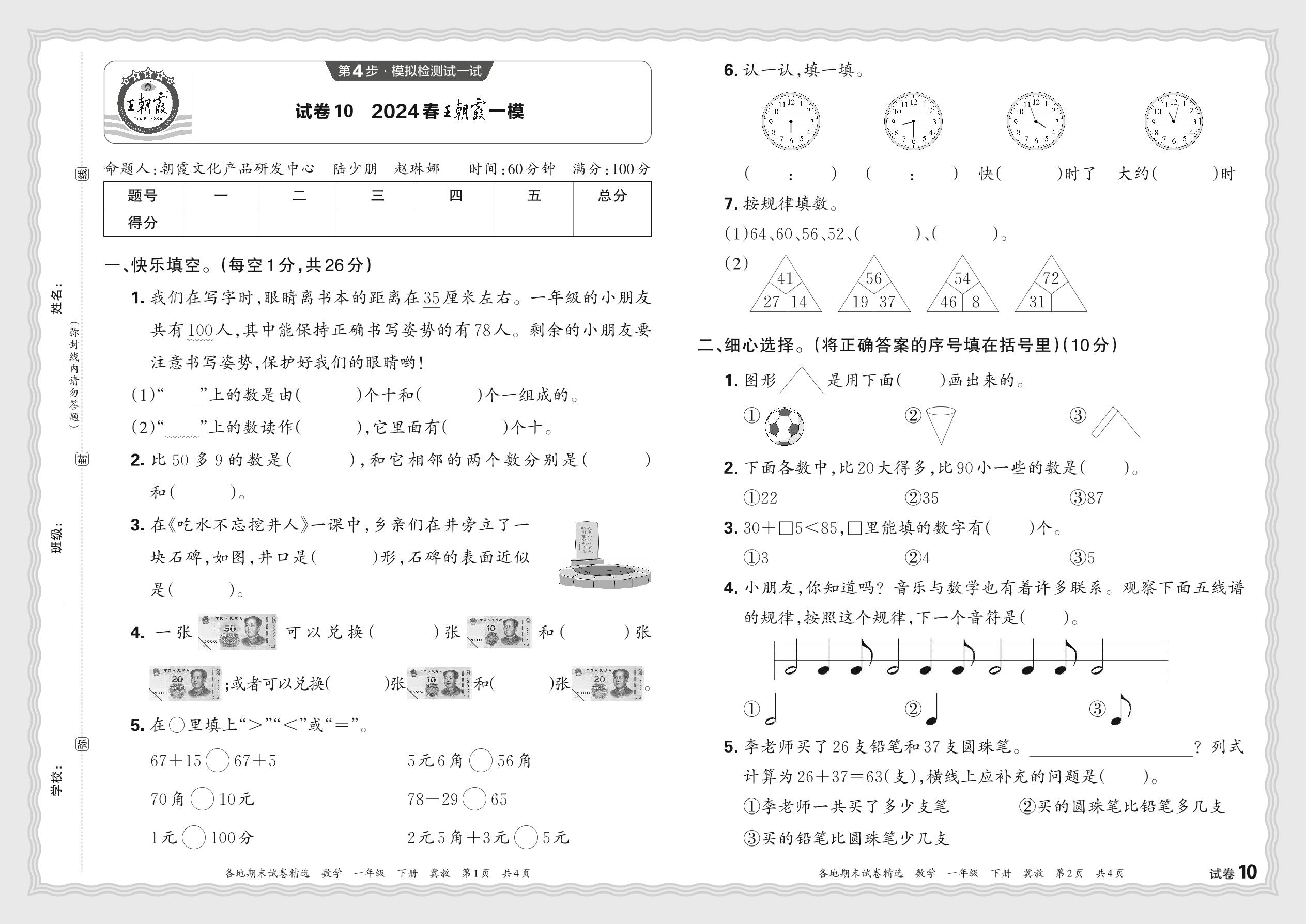 2024春下册一年级数学冀教版 王朝霞一模JX