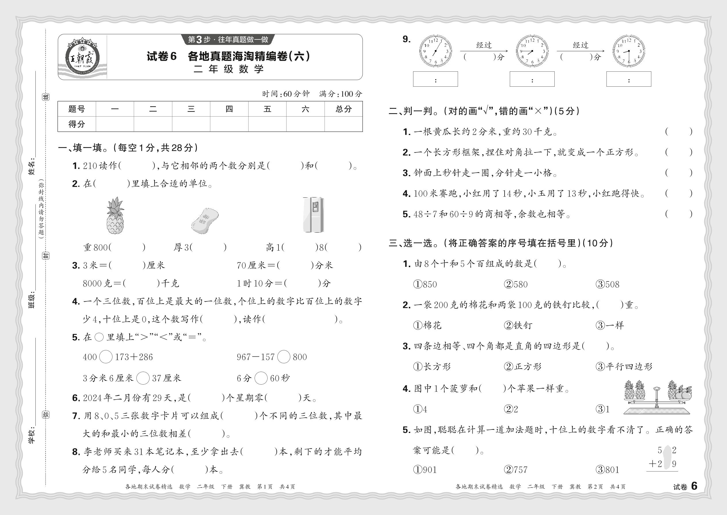 2024春下册二年级数学冀教版 各地真题海淘精编卷(六)JX