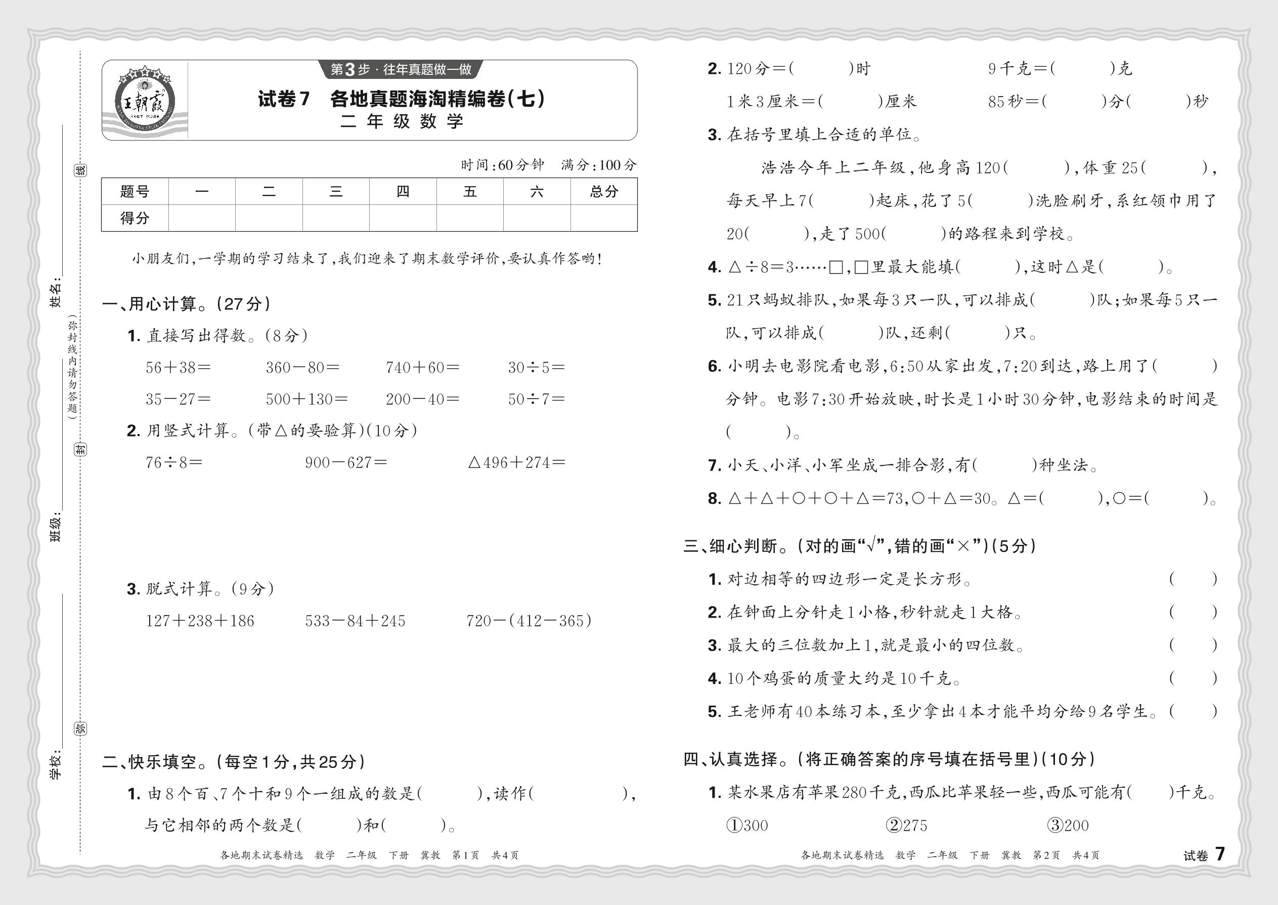 2024春下册二年级数学冀教版 各地真题海淘精编卷(七)JX