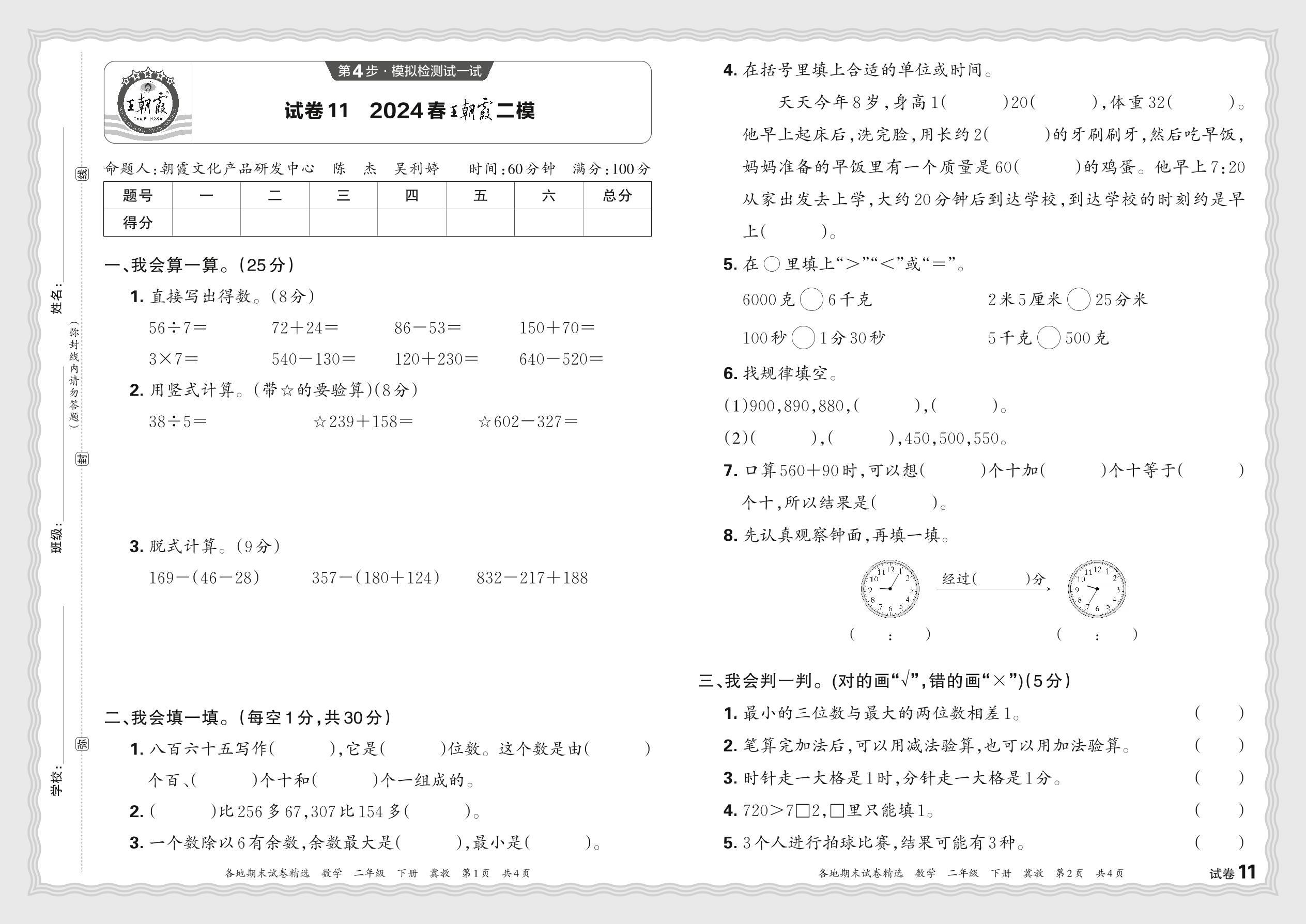 2024春下册二年级数学冀教版 王朝霞二模JX