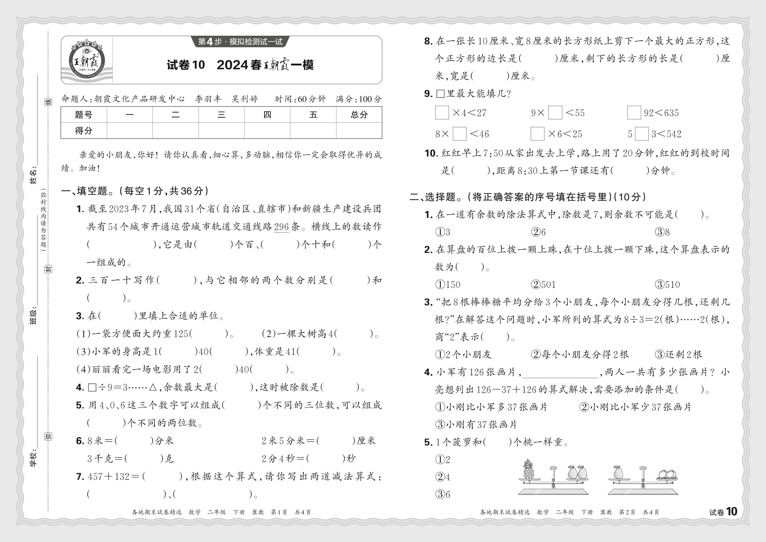 2024春下册二年级数学冀教版 王朝霞一模JX