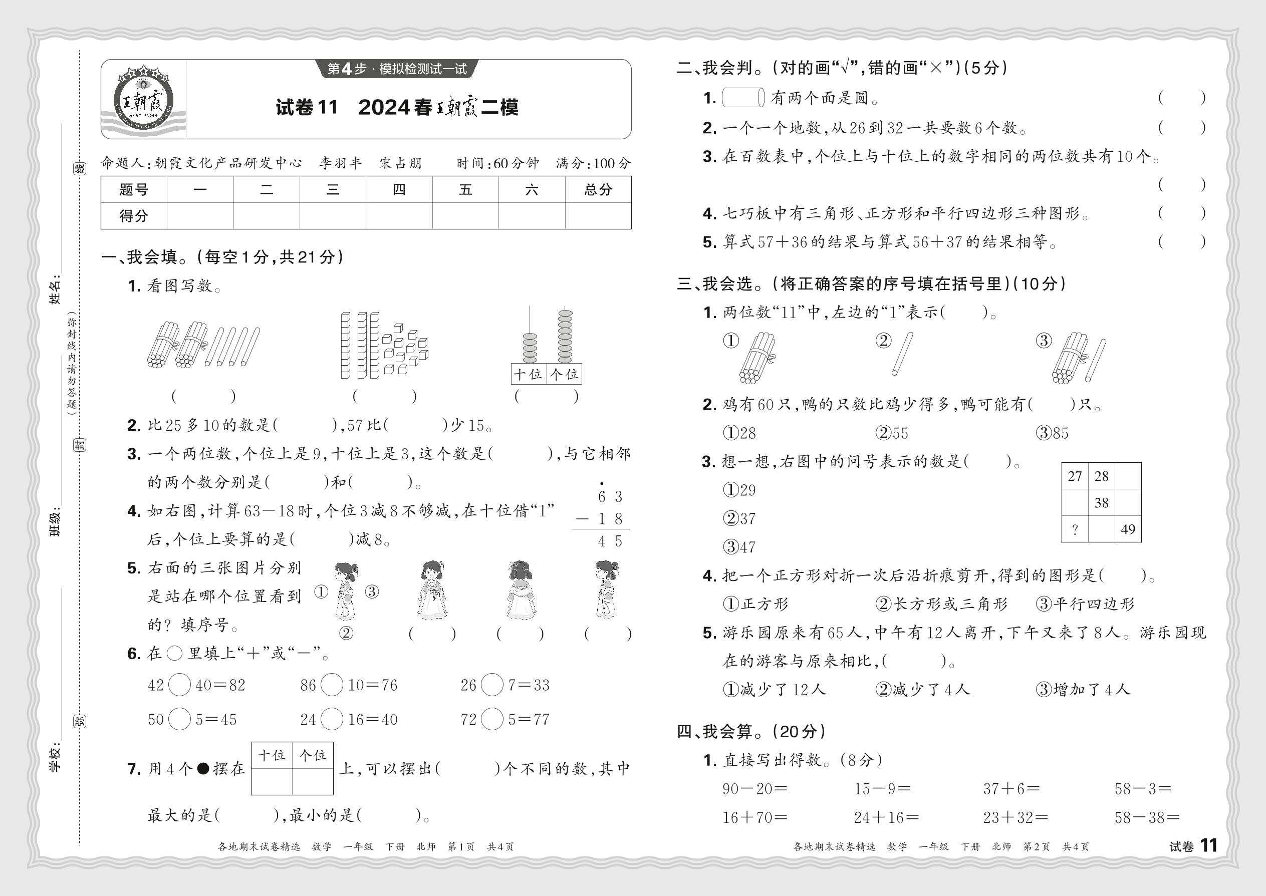 2024春下册一年级数学北师版 王朝霞二模JX