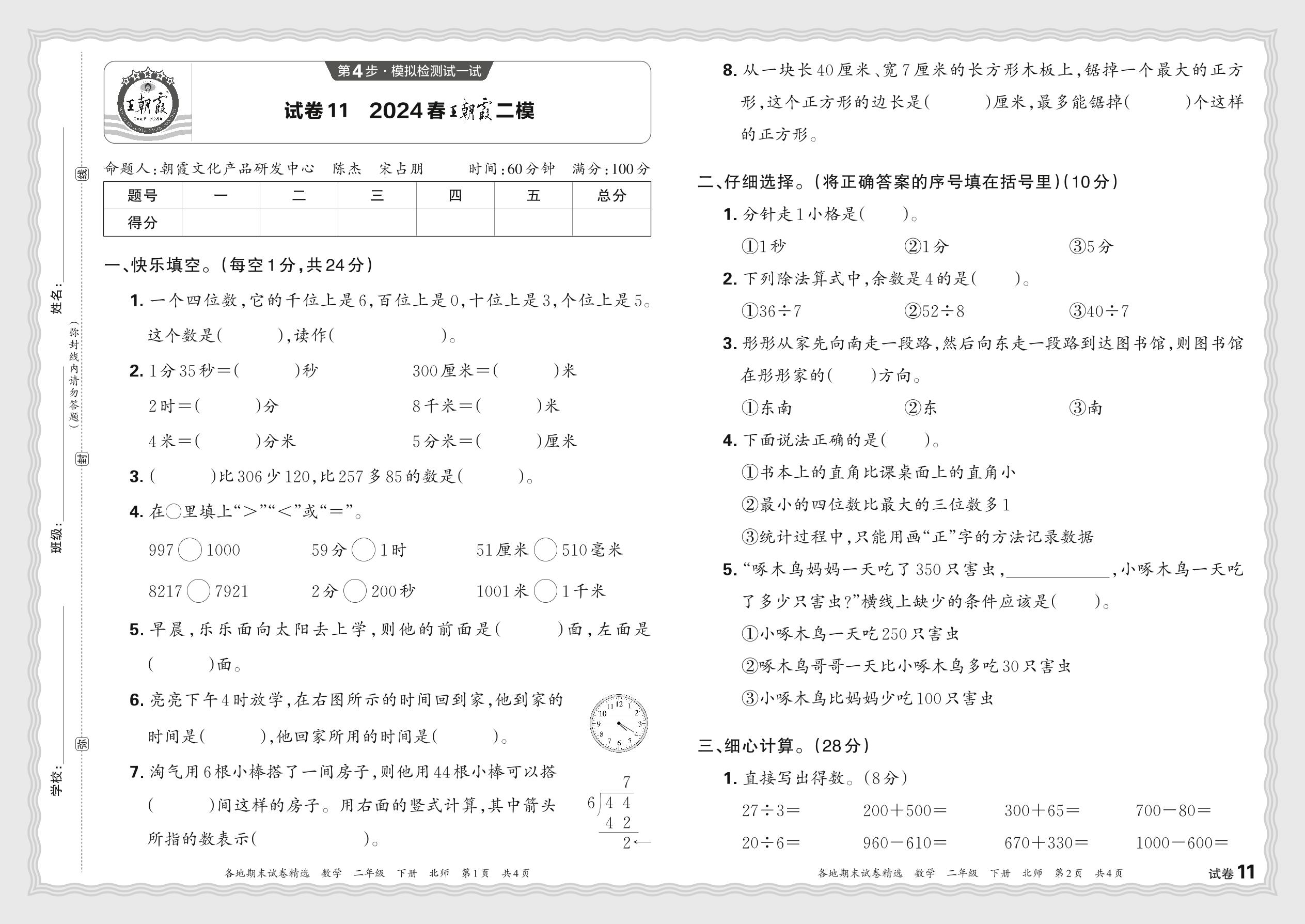2024春下册二年级数学北师版 王朝霞二模JX