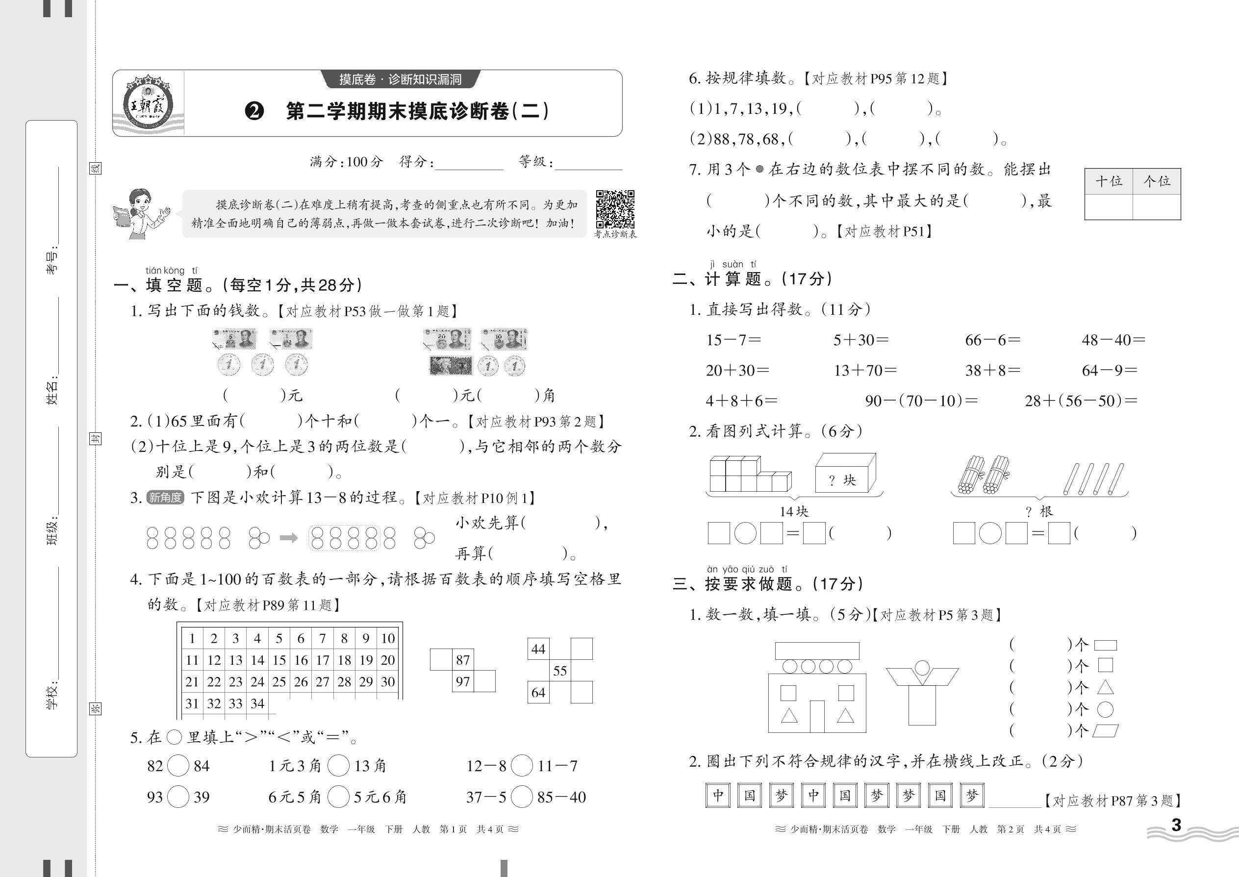 2024春下册一年级数学人教版 第二学期期末摸底诊断卷(二)