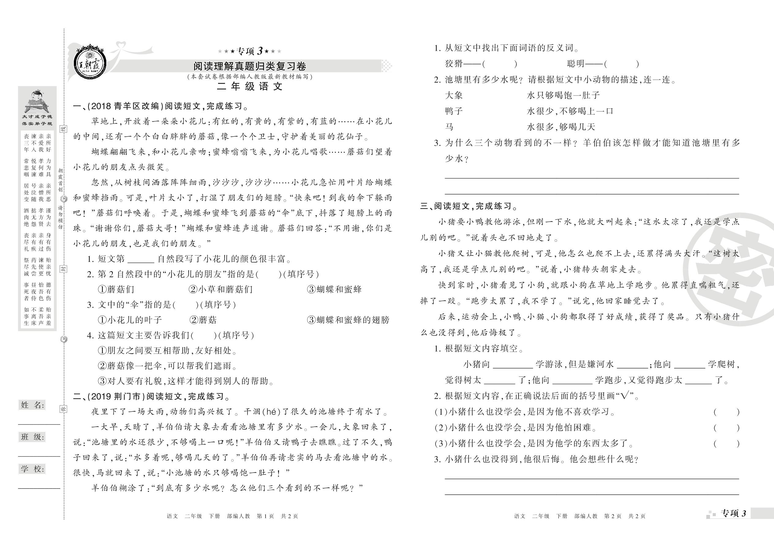 王朝霞期末专项卷——阅读理解、写话真题归类复习卷二年级下册语文(人教版)_R21080165834【0】