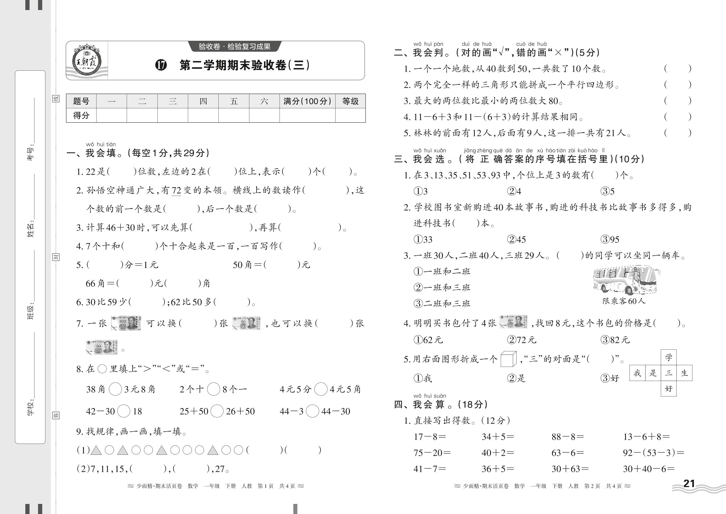 2024春下册一年级数学人教版 第二学期期末验收卷(三)