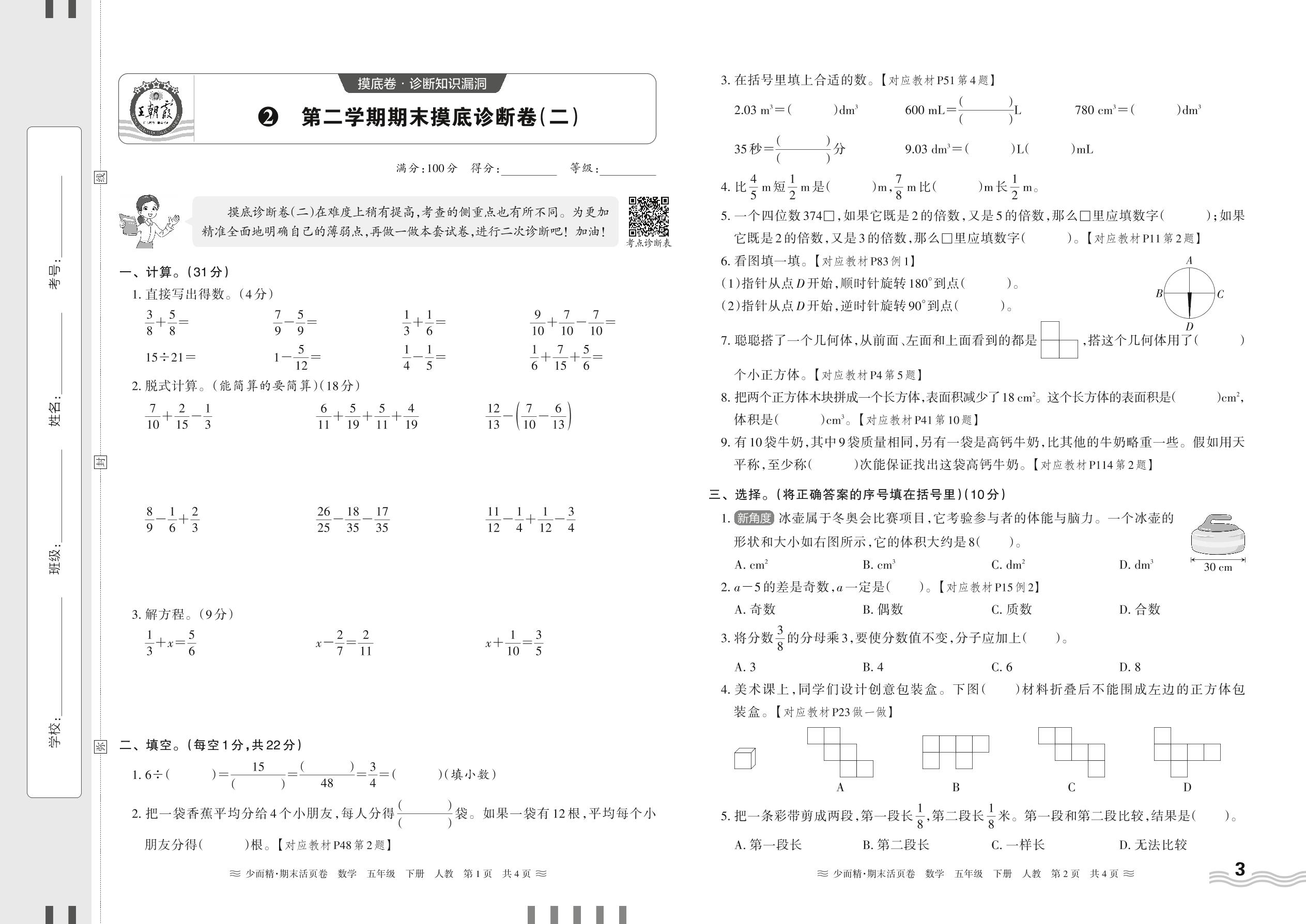 2024春下册五年级数学人教版 第二学期期末摸底诊断卷(二)