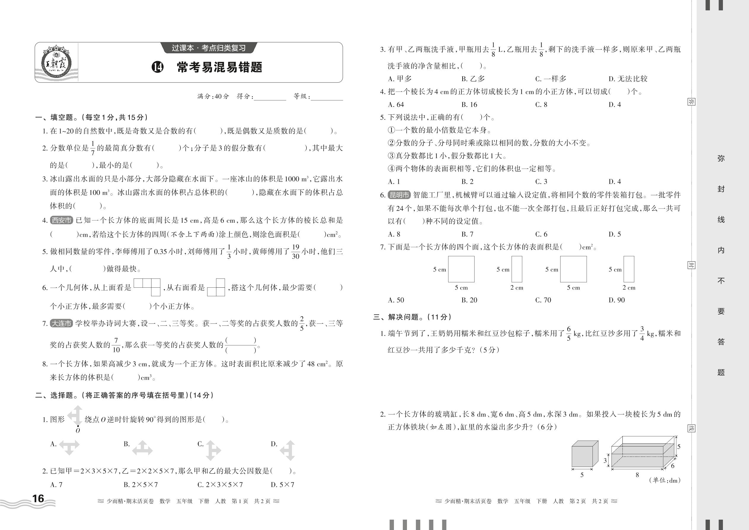 2024春下册五年级数学人教版 期末过课本HY版·常考易混易错题【14】