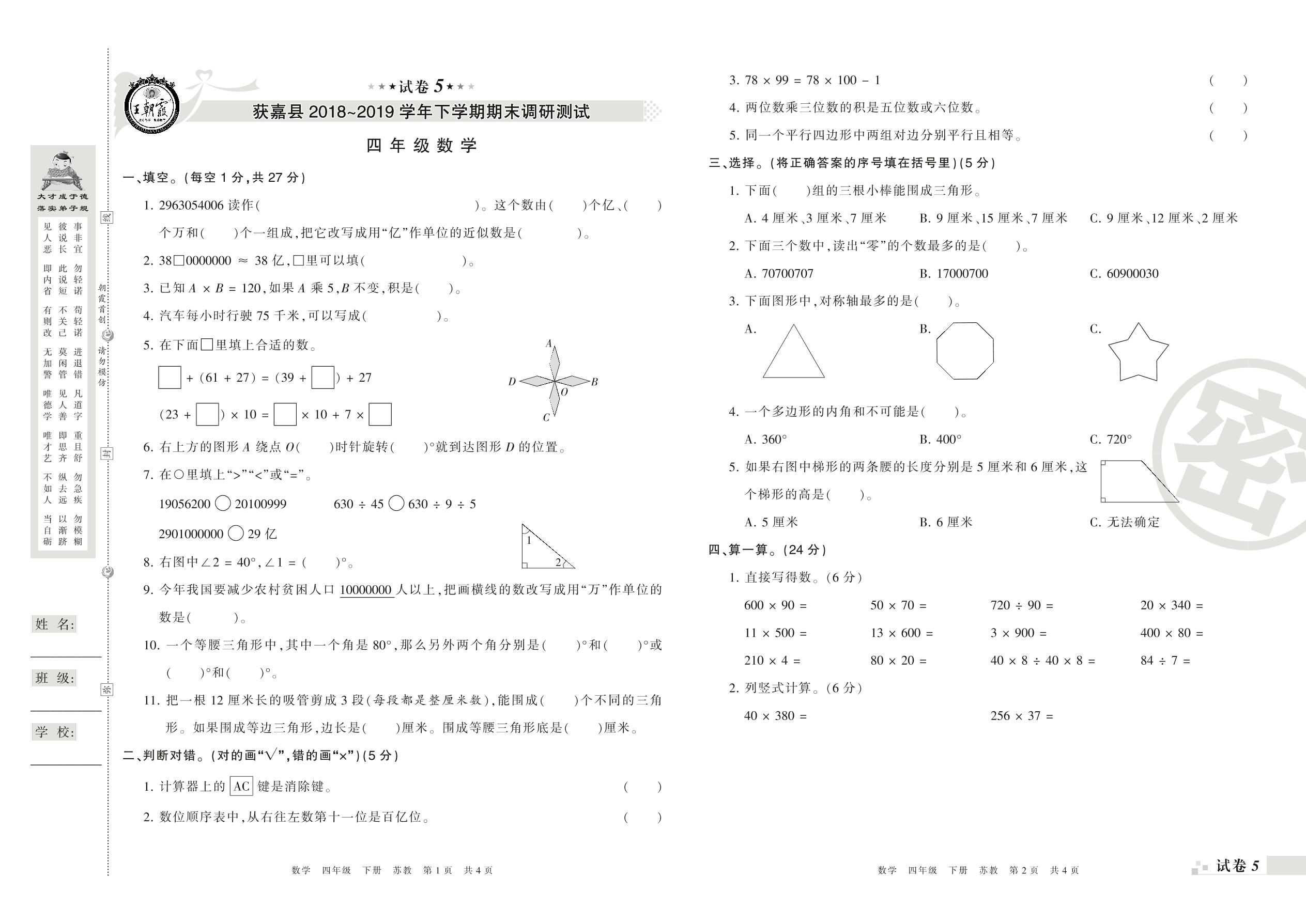 2018-2019学年第二学期新乡市获嘉县四年级数学试卷(苏教版)【5】